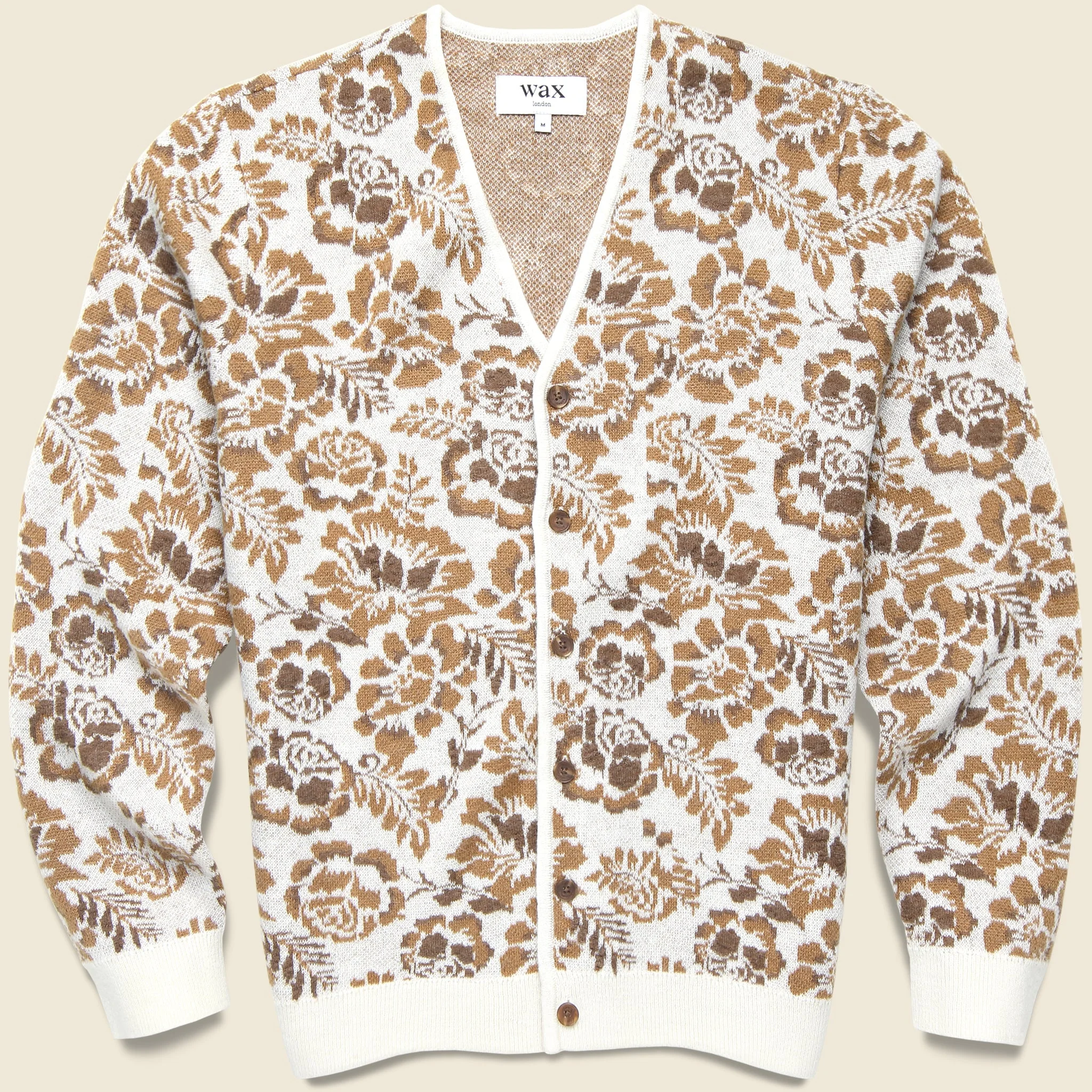 The Alban Cardigan from Wax London is made from a super soft wool-nylon blend to envelop you in warmth and comfort on brisk, spring days and has been specially knit with a subtle botanical pattern. It’s tailored with a relaxed, boxy fit that runs true to size and comes detailed with a simple 6-button placket, and contrast ribbing at the hem and cuffs. - Soft wool-nylon blend - Floral Jacquard pattern - Contrast ribbing at the hem and cuffs - Simple 6-button placket - Relaxed, boxy fit that runs true to size - We recommend taking your normal size Materials: 41% nylon, 26% acrylic, 22% wool, 9% mohair, 2% alpaca The following measurements are for size Medium: Chest: 45” | Shoulder: 18” | Sleeve: 34” | Length: 26 ½”
