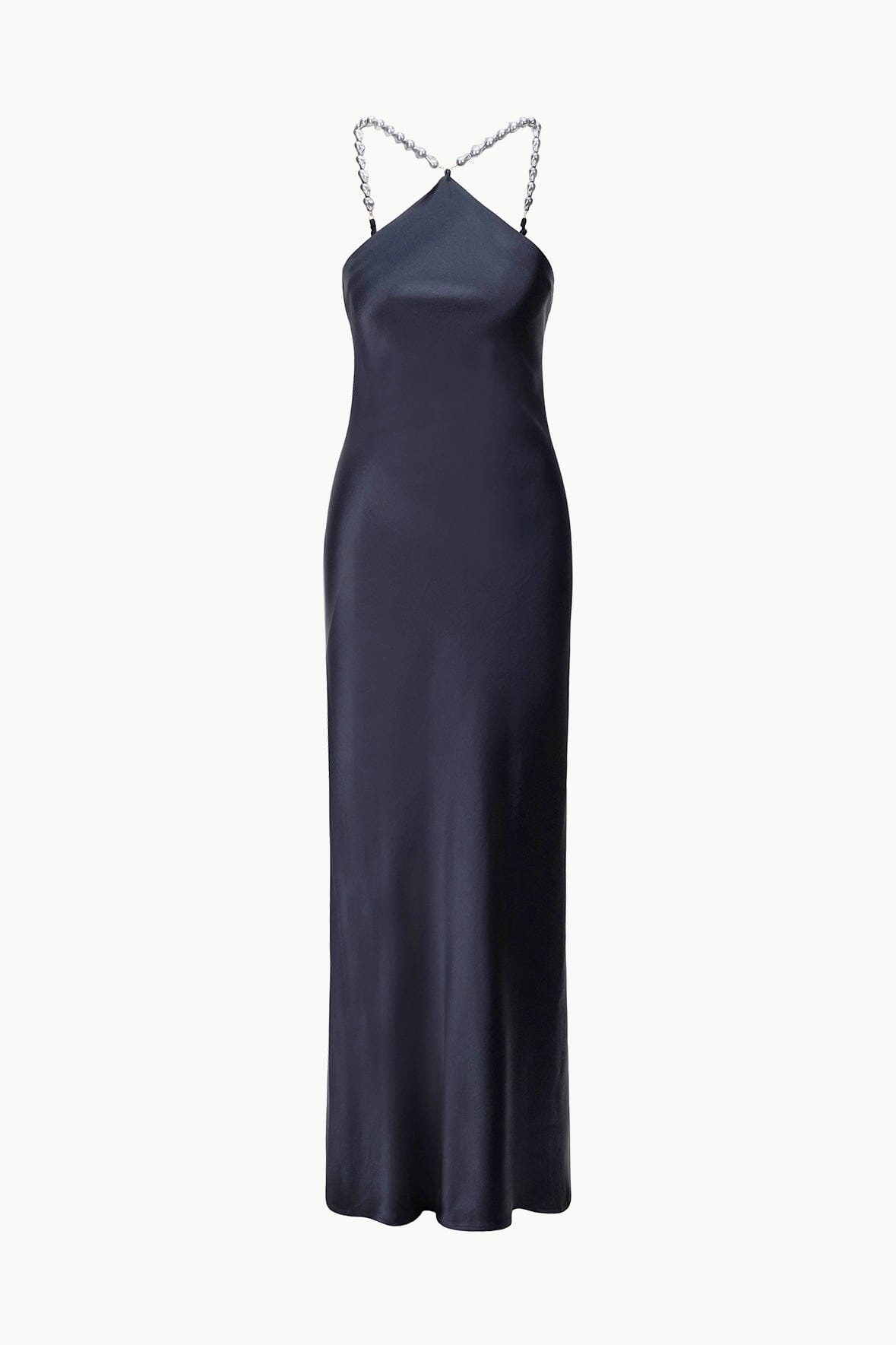 The Cadence is a floor length slip dress featuring a halter neckline with beaded straps. This dress is crafted in satin and has a hidden back zipper. MORE DETAILS - 76% Acetate, 24% Polyester - Model is 5'10 and wearing a size 2 - Dry Clean Only