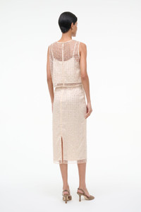 The Ciara Skirt is a fully beaded sheer tulle column skirt, featuring a fully removable lining. MORE DETAILS - 100% Polyester - Model is 5'10 and wearing a size 4 - Dry Clean Only
