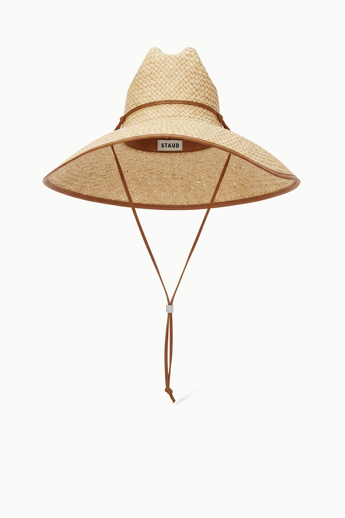 The Cove Hat is a wide-brim woven straw hat with leather trim. This style features a chin strap with signature metal hardware. MORE DETAILS - Straw Hat with Drawstring - Self: 100% Straw, Trim: 100% Cow Leather
