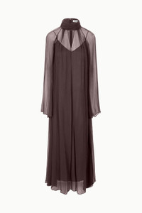 The Esther Maxi Dress is a long sleeve flowy maxi dress featuring a sheer chiffon overlay, a keyhole cutout, and a scarf neck tie feature. MORE DETAILS - Self: 100% Viscose, Slip: 95% Polyester, 5% Elastane - Model is 5'10 and wearing a size S - Dry Clean Only