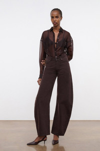 The Jackson Jean is a dramatic barrel-leg silhouette with a flattering V-waist that sits high on the hip. Cut from rigid denim with antique-finish hardware, it’s detailed with a cinching V-shaped yoke at the back and logo-embroidered zip fly.