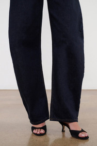 The Jackson Jean is a dramatic barrel-leg silhouette with a flattering V-waist that sits high on the hip. Cut from Italian rigid denim with antique-finish hardware, it’s detailed with a cinching V-shaped yoke at the back and logo-embroidered zip fly. MORE DETAILS - Fabrication: 100% Italian Cotton - Denim Weight: 13oz - Care: Machine wash cold, inside out. Lay flat or hang to dry. - Model is 5'10 and wearing a size 25 with a 33" inseam. - Rise: High - Inseam Options: 33” - Fit: Dramatic barrel-leg