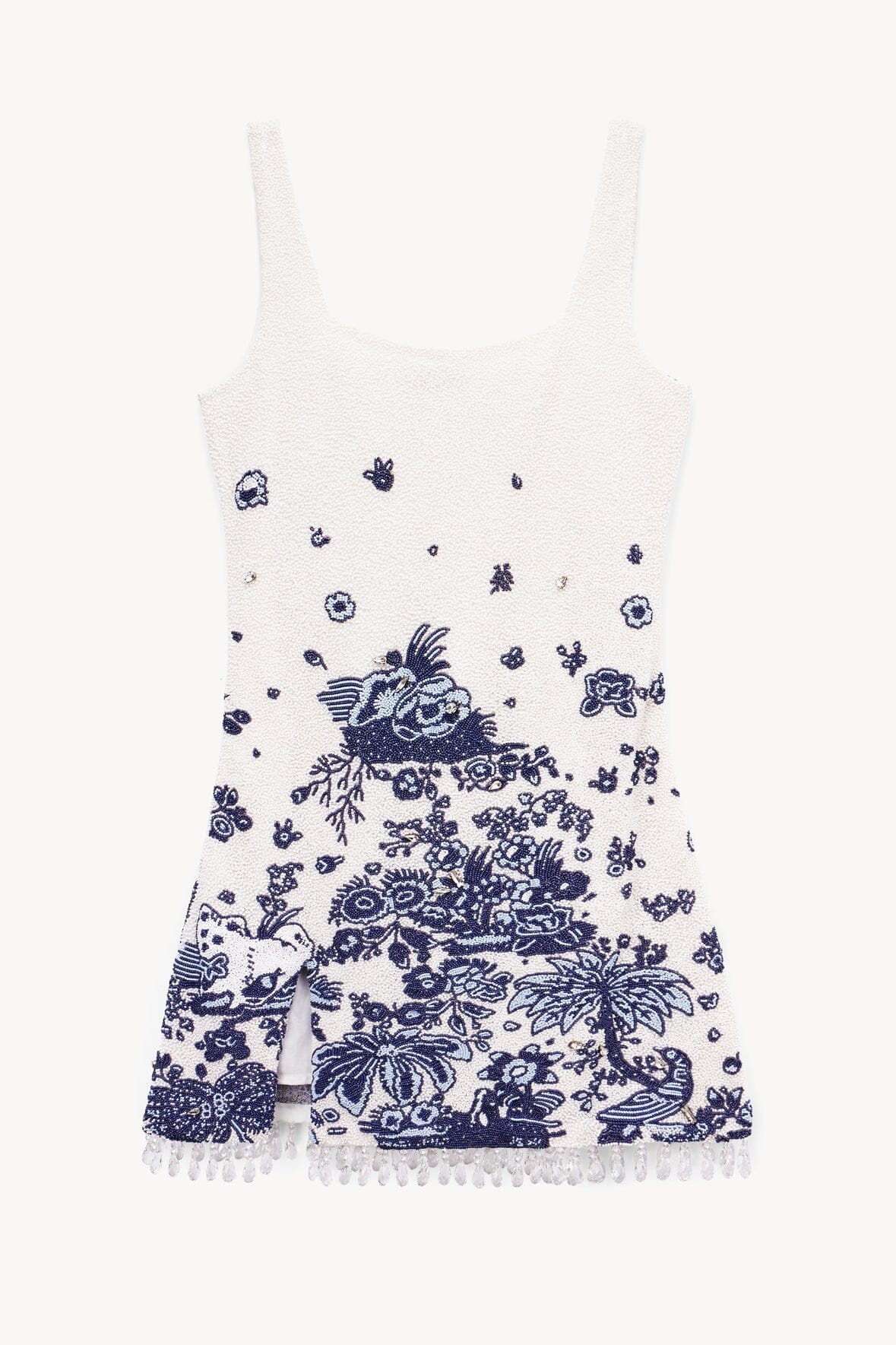 <!-- td {border: 1px solid #cccccc;}br {mso-data-placement:same-cell;} --> A fully hand-beaded mini dress, the Le Sable Dress features a side slit and hanging crystal fringe at the hem. MORE DETAILS - Face: 95% Nylon, 5% Elastane; Base: 100% Glass Beads; Lining: 100% Polyester - Model is 5'11" and wearing a size Small - Dry Clean Only