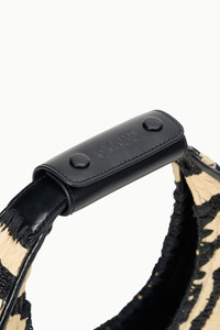 Our classic Moon Tote is updated in a seasonal zebra print raffia. This style features a removable STAUD-embossed handle accent and a magnetic snap closure. MORE DETAILS - Raffia Shoulder Bag - Self: 100% Natural Raffia, Trim: 100% Cow Leather