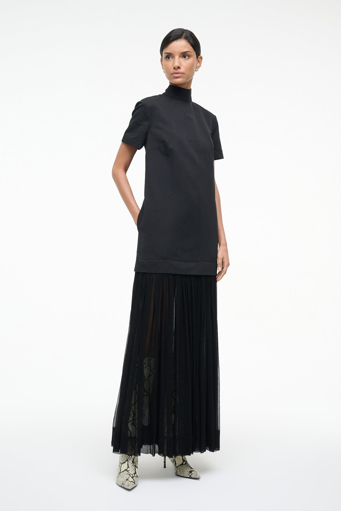 The Pia Dress is a new tent maxi dress crafted in grosgrain, with a sheer chiffon skirt. This style features short sleeves, an open back, and a tie at the neck.