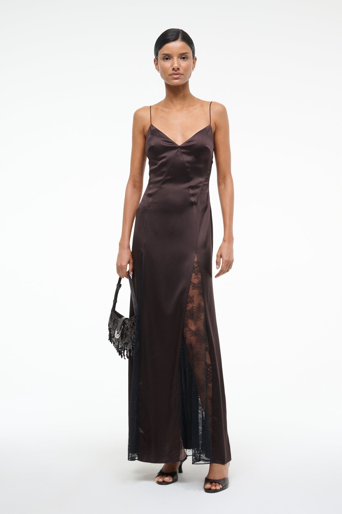 The Trinity is a maxi length slip dress with lace inserts down the front and back of the skirt. It features a v-neckline, low back and spaghetti straps. MORE DETAILS - Self: 93% Silk, 7% Elastane, Lining: 100% Polyester - Model is 5'9 and wearing a size 4 - Dry Clean Only
