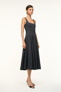 The Wells Dress features a corset-style panel construction to create a flattering, fitted shape through the waist and a midi length a-line skirt. Made out of lightweight cotton poplin.