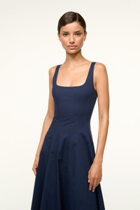 The Wells Dress features a corset-style panel construction to create a flattering, fitted shape through the waist and a midi length a-line skirt. Made out of lightweight cotton poplin.