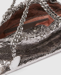 Item 7B0144WP05871113U The new Falabella drawstring crossbody bag reimagines our vegan icon, with a cracked metallic finish on cruelty-free materials. A signature diamond-cut recycled brass and recyclable aluminum chain serves as a shoulder strap, with enough room for your phone, wallet and daily essentials. Fully lined with monogrammed recycled fabric, wear it over the shoulder or sling it across your ensemble for a classic day-to-night look. - Color: Silver - Comfortably fits all phones and wallets alongside daily essentials - Vegan leather alternative - Cracked metallic finish - Signature recycled brass and aluminum diamond-cut crossbody chain - Waxed GOTS-certified organic cotton lacing - Two top handles - One crossbody strap - One main compartment - One internal zipper pocket - Magnetic snap fastening - Engraved logo medallion charm - Recycled polyester monogram lining - Handcrafted in Italy Product Care & Fit Advice - Care: Spot clean only with soft damp cloth. - Composition: 100% Polyester - Fit: Fits all phones, wallets and small daily essentials. - Size: 8.6 x 5.7 x 3.9 in - Strap length: 8.2 in - Weighs approximately 18.8 oz