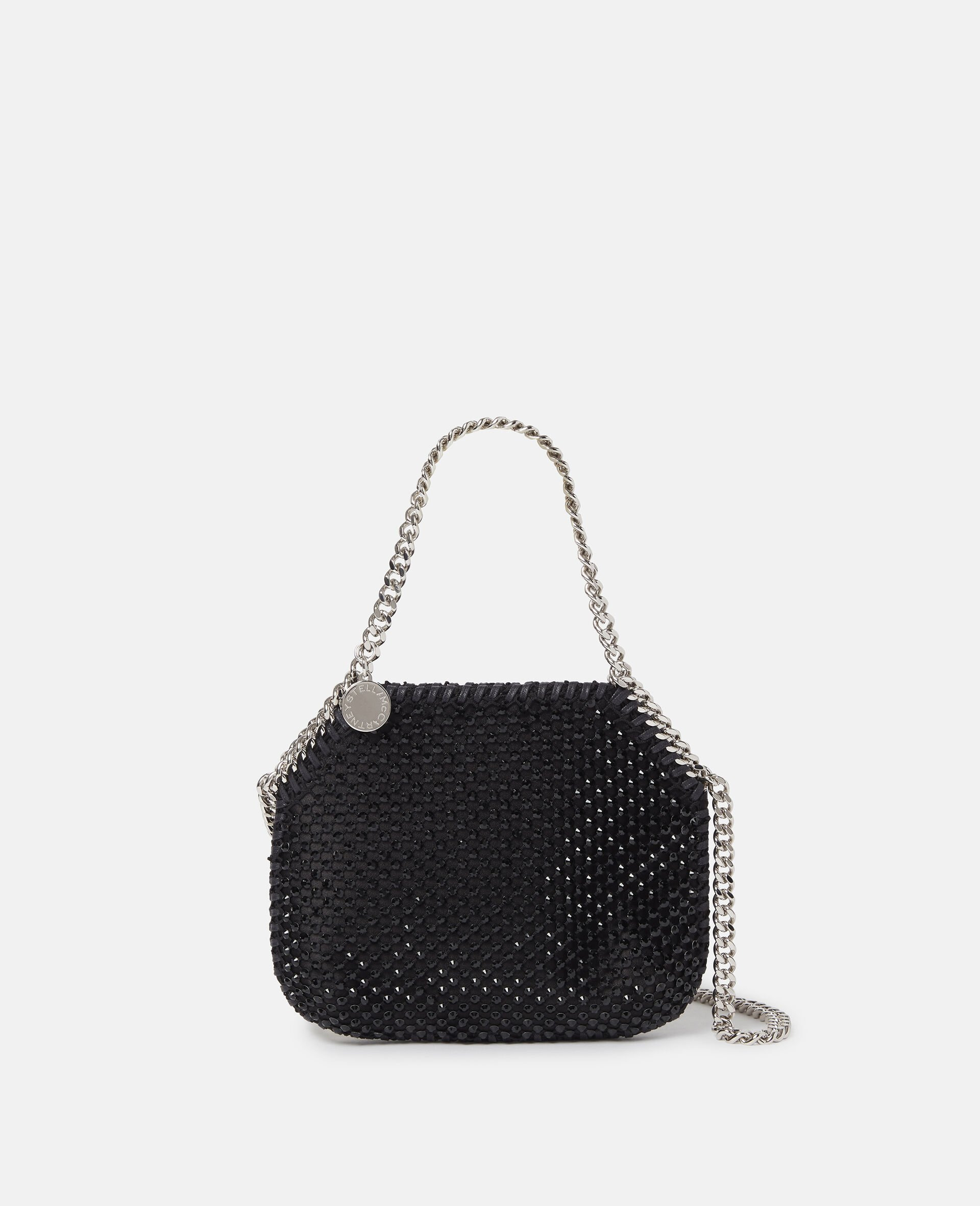 Item 700109WP02291000U Primed for evening wear, this Falabella mini tote bag is carefully crafted from intricate crystal mesh. The Italian-made tote is elevated with our iconic diamond-cut chain and an engraved logo medallion charm. - Colour: Silver - Shimmering silver - Satin with crystal mesh overlay - Signature palladium diamond-cut chain - GOTS-certified cotton lacing - Shoulder strap, and two top handles - One internal slip pocket - Magnetic snap fastening - Engraved palladium logo medallion charm - Fully lined with recycled materials - Made in Italy Product Care & Fit Advice - Care: Do not wash or clean. Avoid scrubbing to prevent damaging the surface of the bag. As this accessory is made from very delicate material, we recommend handling with care and avoiding contact with any sharp objects, jewellery or rough surfaces. When not in use, always store the item in its protective bag. - Composition: Main fabric: 100% raffia, Trims: 70% polyurethane, 15% polyester, 15% polyamide, Lacing: 50% polyamide, 50% polyurethane - Size: 18.5 x 15 x 5cm - Handle drop: 10cm - Strap length: 46cm - Weighs approximately 0.456kg - All of our shoes and accessories are made from non-leather materials as part of our cruelty-free ethos.