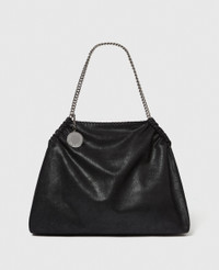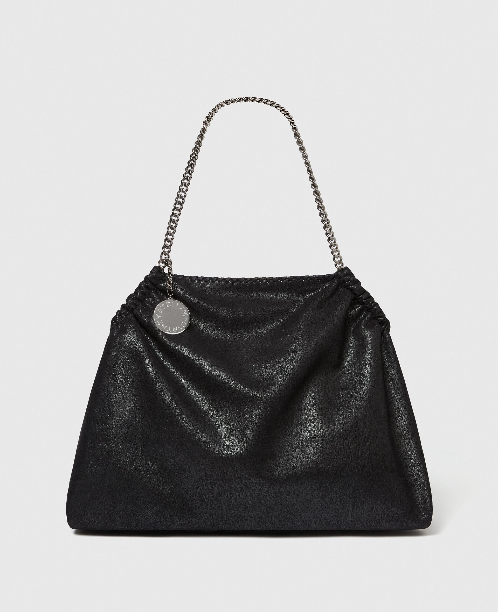 Item 7B0141W91321000U New for Spring 2025, the Falabella drawstring tote bag provides a fresh take on our iconic Falabella. A signature diamond-cut recycled brass and aluminium chain serves as a shoulder strap, with enough room for a laptop and more. Fully lined with monogrammed recycled fabric, wear the vegan Baby Bella over your shoulder for a classic day-to-night look. - Color: Black - Comfortably fits all tablets and laptops alongside daily essentials - Matte vegan Shaggy Deer fabric with semi-gloss grain - Signature gold recycled brass and aluminum diamond-cut chain - Waxed GOTS-certified organic cotton lacing - Two top handles - One main compartment - One internal zipper pocket - Magnetic snap fastening - Engraved gold logo medallion charm - Recycled polyester monogram lining - Handcrafted in Italy Product Care & Fit Advice Care: Spot clean only with soft damp cloth. Composition: 100% Polyester - Fit: Comfortably fits all tablets and laptops alongside daily essentials. - Size: 18.3 x 14.9 x 6.6 in - Handle drop: 8.6 in - Weighs approximately 34.9 oz