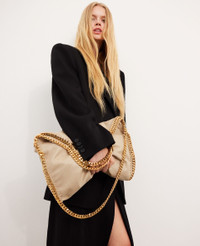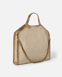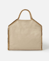 Item 234387W93559300U An adaptable iteration of our iconic Falabella tote, this fold-over tote bag is infinitely wearable. The signature diamond-cut recycled brass and aluminium chain instantly characterises this dynamic bag. Fully lined with a recycled fabric made from plastic bottles, wear the Falabella fold-over tote in one hand for a classic look or over the shoulder to showcase its duality. - Colour: Clotted Cream - Buttery cream beige - Comfortably fits all tablets and 15" laptops alongside daily essentials - Matte vegan Shaggy Deer fabric with semi-gloss grain - Signature gold recycled brass and aluminium diamond-cut chain - Waxed GOTS-certified organic cotton lacing - Two top handles, and one shoulder strap - One main compartment - One internal slip pocket - Magnetic snap fastening - Engraved gold logo medallion charm - Recycled polyester monogram lining - Made in Italy Product Care & Fit Advice - Care: Use a soft damp cloth with a small amount of demineralised water (likewise for ironing) and apply to all the material. Leave the bag to dry. Avoid scrubbing to prevent damaging the surface of the bag. As this accessory is made from very delicate fabric, we recommend handling with care and avoiding contact with any sharp objects, jewellery, or rough surfaces. When not in use, always store the item in its protective bag. - Composition: Main fabric: 55% polyester, 45% GRS-certified Newlife™ post-consumer recycled polyester, Trims: 70% solventless polyurethane, 30% post-consumer recycled polyester, Lacing: 100% GOTS-certified organic cotton with corn starch wax coating, Handle/strap: 100% recycled brass, Body chain: 100% aluminium, Medallion: 100% zamac, Magnet: 100% stainless steel, Lining: GRS-certified post-consumer recycled polyester - Fits all tablets and 15" laptops. - Size: 37 x 36 x 9cm / 14.5 x 14 x 3.5in. - Handle drop: 11cm - Strap length: 22cm - Weighs approximately 0.85kg - This tote can be worn two ways, folded over as a shoulder bag or as a handheld tote. - All of our shoes and accessories are made from non-leather materials in keeping with our cruelty-free ethos.