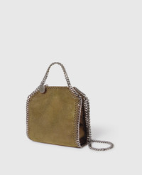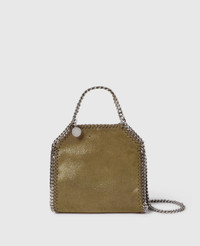 Item 391698W91323032U Elevate everyday dressing with this iconic Stella McCartney Falabella Tiny tote bag. Responsibly made from our signature grained Shaggy Deer fabric, this vegan tote bag is framed by a recycled brass and recyclable aluminum diamond-cut chain and is lined with recycled materials. There’s a slip pocket inside for smaller items, while the main compartment is roomy enough for keys, a phone and lipstick. - Color: Olive - Comfortably fits all phones alongside small daily essentials - Matte Shaggy Deer vegan alternative to animal leather with semi-gloss grain - Signature recycled brass and recyclable aluminum diamond-cut chain - Waxed GOTS-certified organic cotton lacing - Two top handles, one shoulder strap - One main compartment - One internal slip pocket - Magnetic snap fastening - Engraved logo medallion charm - Recycled polyester monogram lining - Handcrafted in Italy - All of our shoes and accessories are made from non-leather materials in keeping with our cruelty-free ethos. Product Care & Fit Advice - Care: Spot clean only with soft damp cloth. - Composition: 100% Polyester - Fit: Comfortably fits small daily essentials. - Size: 7 x 6.8 x 2.3 in - Handle drop: 2.7 in - Strap length: 18.5 in - Weighs approximately: 14.4 oz