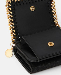 Item 521371W93551000U The natural companion to our iconic Falabella tote bag, this Falabella flap wallet is carefully considered from its pocket organisation to its cruelty-free vegan ‘Shaggy Deer’ fabric. This black cream purse includes room for notes, pocket change and up to six credit cards. - Colour: Black - Midnight black - Matte vegan Shaggy Deer fabric with semi-gloss grain - Signature gold recycled brass and aluminium diamond-cut chain - Waxed GOTS-certified organic cotton lacing - Tri-fold main compartment - One bills slip pocket - Press stud fastening coin pocket - Press stud fastening - Engraved gold zamac logo medallion charm - Made in Italy Product Care & Fit Advice - Care: Use a soft damp cloth with a small amount of demineralised water (likewise for ironing) and apply to all the material. Leave the bag to dry. Avoid scrubbing to prevent damaging the surface of the bag. As this accessory is made from very delicate fabric, we recommend handling with care and avoiding contact with any sharp objects, jewellery, or rough surfaces. When not in use, always store the item in its protective bag. - Composition: Main fabric: 55% polyester, 45% GRS-certified Newlife™ post-consumer recycled polyester, Trims: 70% solventless polyurethane, 30% post-consumer recycled polyester, Lacing: 100% GOTS-certified organic cotton with corn starch wax coating, Chain: 100% aluminium, Medallion: 100% zamac, Magnet: 100% stainless steel, Lining: GRS-certified post-consumer recycled polyester - Size: 10 x 7.5 x 3cm - Weighs approximately 0.12kg - All of our shoes and accessories are made from non-leather materials in keeping with our cruelty-free ethos.