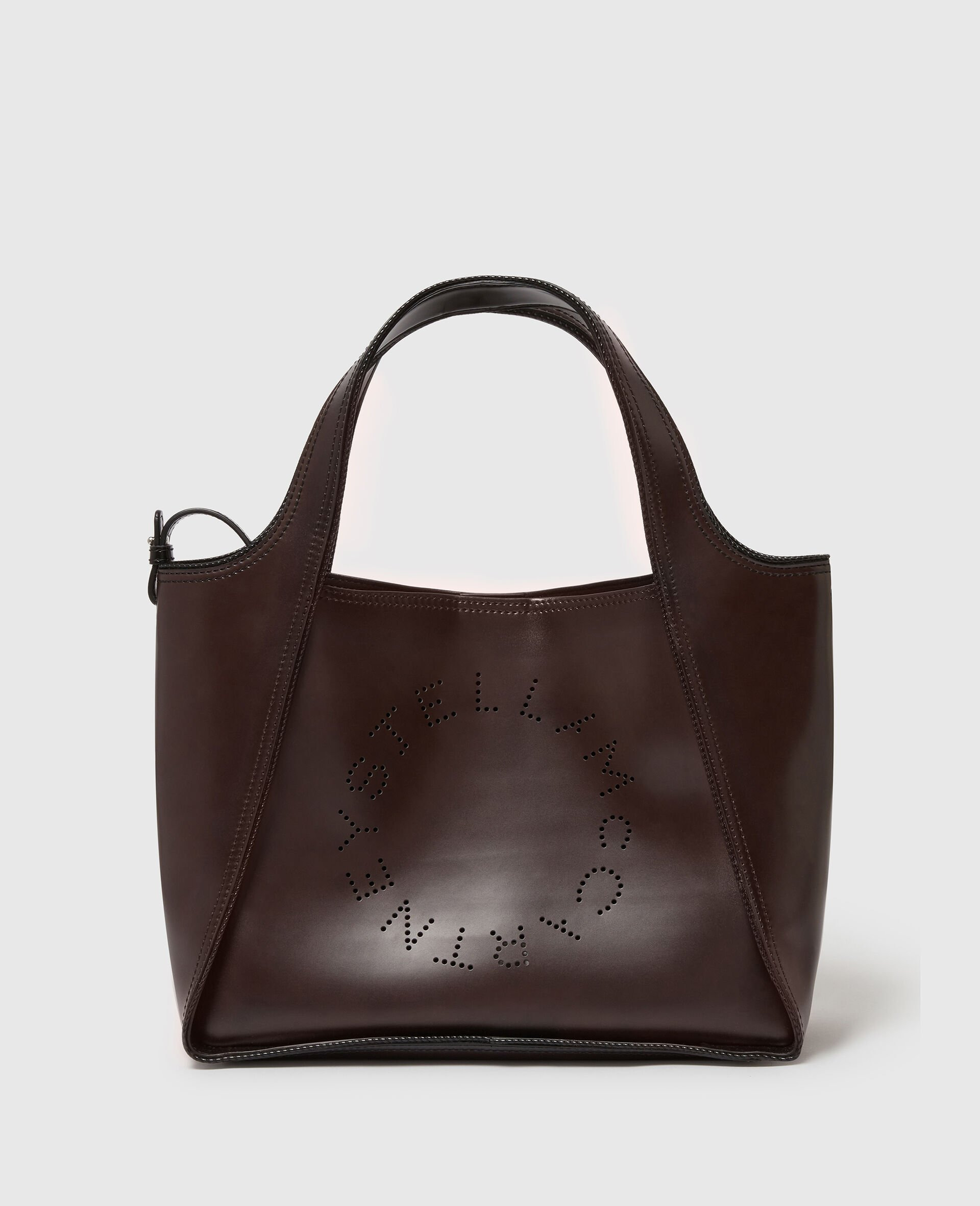 Item 513860WP06252140U The Stella Logo crossbody tote bag is a versatile year-round accessory, effortlessly worn crossbody, over the shoulder or held by its top handles. It is crafted from our luxury vegan alternative to animal leather, with a butter-soft hand-feel, and features our iconic circular Stella McCartney logo on the front. It is spacious enough for a tablet, phone and other daily essentials. - Color: Black/Brown - Comfortably fits all phones, tablets and wallets alongside small daily essentials - Smooth vegan alternative to animal leather sourced from recycled materials - Perforated Stella McCartney circular logo on front - Tonal single topstitching - Two top handles, and adjustable crossbody strap - One main compartment - Detachable pouch included - Magnetic snap fastening - Stainless steel and recycled brass hardware - Vegan alternative to suede lining - Handcrafted in Italy Product Care & Fit Advice - Care: Spot clean only with soft damp cloth. - Composition: 100% Polyester - This is a coated fabric - Fit: Comfortably fits all tablets alongside daily essentials. - Size: 12.4 in × 8.7 in × 5.1 in - Handle drop: 5.1 in - Strap length: 18.5-20.4 in - Weighs approximately 18.5 oz