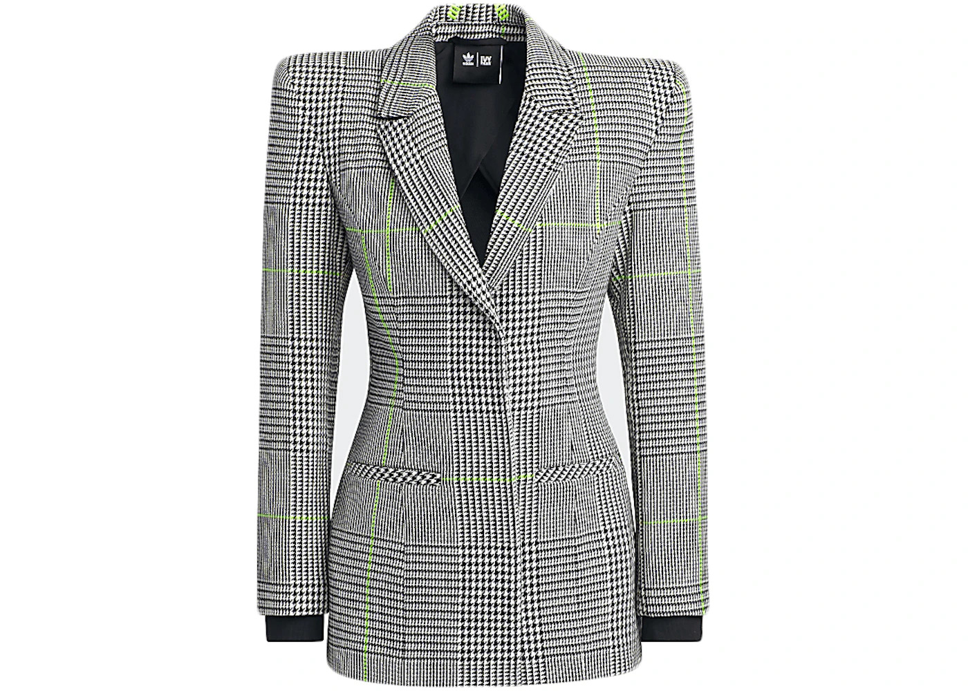 Delivered as part of the December 2021 adidas x Ivy Park Halls of Ivy collection, this adidas Ivy Park Halls of Ivy Suit Jacket was made available alongside more than 100 new apparel items. This suit jacket's exterior is made from 50% cotton, 50% polyester plain weave while the interior is made from a 100% recycled polyester plain weave material. This suit jacket features an all-over black-and-white plaid pattern with touches of green. The adidas Ivy Park Halls of Ivy Suit Jacket released for the retail price of $130. - Season FW21 - Color White/Black/Semi Solar Slime - Release Date 2021-12-09 - Retail Price 130 - Featured false