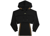 The adidas Ivy Park Hooded Cutout Dress Black features a design with an oversized top and a bodycon skirt. With IVY PARK woven branding prominently displayed on the center of the chest in green and adidas branding on the cuffs, this dress showcases the collaboration between the two brands. Made with a blend of cotton and recycled polyester double-knit, the adidas Ivy Park Hooded Cutout Dress in Black features a hoodie neck and long sleeves. The waist is adjustable with drawcords, allowing for a customizable fit. The dress features a hoodie neck and long sleeves, along with the 3-Stripes in brown on the side of the elastic-fit skirt and the sides of the hoodie. One standout feature of the adidas Ivy Park Dress is its midsection cutouts and the elasticized waistband, which allows the dress to conform to different body shape. The adidas Ivy Park Hooded Cutout Dress in Black was released on November 17th, 2020, with a retail price of $120. - Season FW20 - Color Black - Release Date 2020-11-17 - Retail Price 120 - Featured false