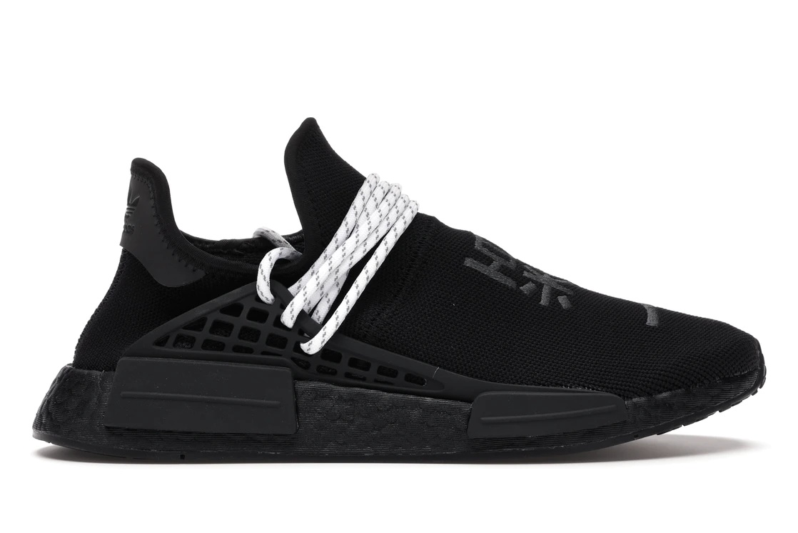 The adidas NMD Hu Pharrell Black is the result from a collaboration between Pharrell Williams and adidas. The sneaker display a monochromatic black colorway. On the shoes, the upper part has a black lace cage system and tonal embroidery that says "Human Race" in Chinese. This is joined by the matching sole unit plugs, two sets of 3M-speckled laces in either white or black, and a black leather heel tab. The co-branded sock liner and heel tab complete the adidas Trefoil and Pharell Williams marking sneaker. Additionally, it features Boost midsole and outsole. The adidas NMD Hu Pharrell Black debuted on 19 November 2020, and retailed at $220. - Style GY0093 - Colorway Core Black/Core Black/Core Black - Retail Price 220 - Release Date 2020-11-19 - Included Accessories Black Rope Laces - Featured false
