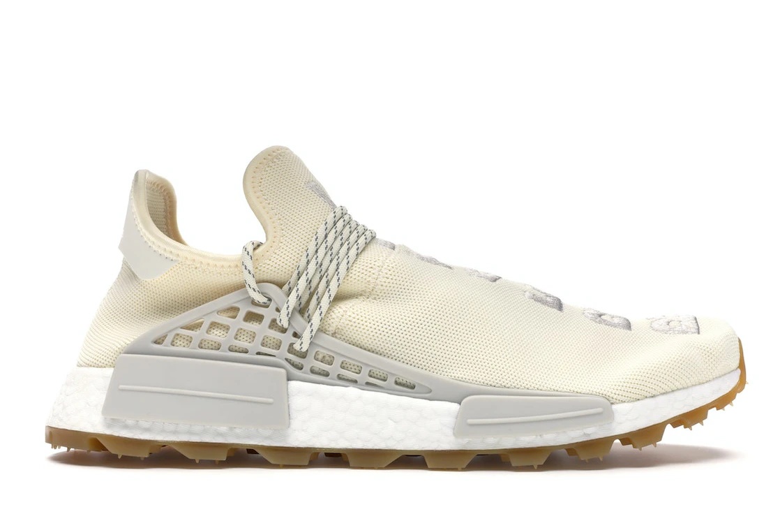 The adidas NMD Hu Trail Pharrell Now Is Her Time Cream White features a Cream White, Raw White, and Gum Three knitted fabric upper, with the Cream White composing the majority of the palette and Raw White making the shade more vibrant at the Boost midsole. From there, plastic tabs merge with the fabric to capture the hiking lacing system of the adidas NMD Hu Trail, and a full, thick tread in gum-colored beige completes the design. The adidas NMD Hu Trail Pharrell Now Is Her Time Cream White released in September 2019 and retailed for $220. - Style EG7737 - Colorway Cream White/Raw White/Gum Three - Retail Price 220 - Release Date 2019-09-13 - Included Accessories Grey Rope Laces - Featured false - Product Line adidas NMD