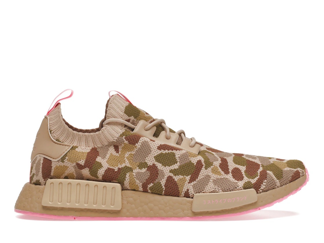 The adidas NMD R1 Primeknit Duck Camo Pink is among the sneakers that form the adidas Nomad collection, which aims to blend sporty design cues, style, and comfort. The body of this adidas NMD R1 features a woven material constructed using proprietary adidas Primeknit technology. The upper has a duck camo shade smoothly matching natural earth tones and light brown borders. On the menial quarter panel, embroidered Katakana characters appear in pink. They spell the signature brand with three stripes insignia on adidas footwear. The heel is stylishly eventful with a pink heel tab and brown leather adorned with an adidas Trefoil in an embossed graphic. What stands out in this adidas NMD R1 Primeknit Duck Camo Pink? The sole has a unique design, with a pink rubber outsole and gently protruding reinforcements on the midsole and heel stabilizer. "The brand with three stripes" Katakana writing appears on the sole. This shoe was released on March 11th, 2021 at a $180 retail price. - Style G57940 - Colorway Duck Camo/Pink - Retail Price 180 - Release Date 2021-03-11 - Featured false - Product Line adidas NMD