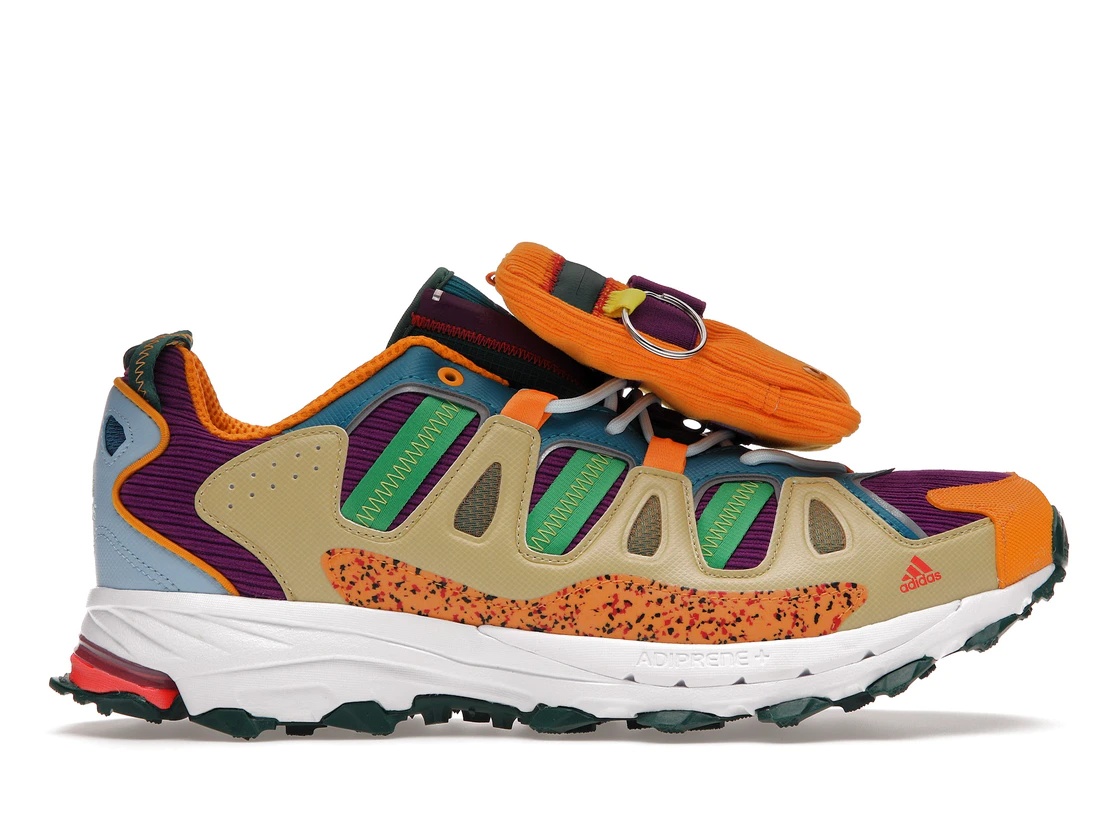 The adidas Superturf Adventure Sean Wotherspoon Jiminy Cricket was released as a part of the Disney, adidas Superturf Adventure, and Sean Wetherspoon’s collaboration, honoring the character of Jiminy Cricket. The shoe’s design features a Sail/Orange/Purple/Teal color scheme. The adidas Superturf Adventure Sean Wotherspoon Jiminy Cricket is constructed with eco-friendly contents, blending materials such as vegan, nylon, and synthetic corduroy. This trail-runner sneaker reveals vibrant hues. Other features include a speckled orange mudguard, green three-stripes branding, and upper combining tan synthetic leather overlays with a purple corduroy base. An orange-and-green outsole completes the sneaker’s design. The adidas Superturf Adventure Sean Wotherspoon Jiminy Cricket was released at a retail price of $160 on September 25th, 2021. - Style GY8341 - Colorway Sail/Orange/Purple/Teal - Retail Price 160 - Release Date 2021-09-25 - Featured false