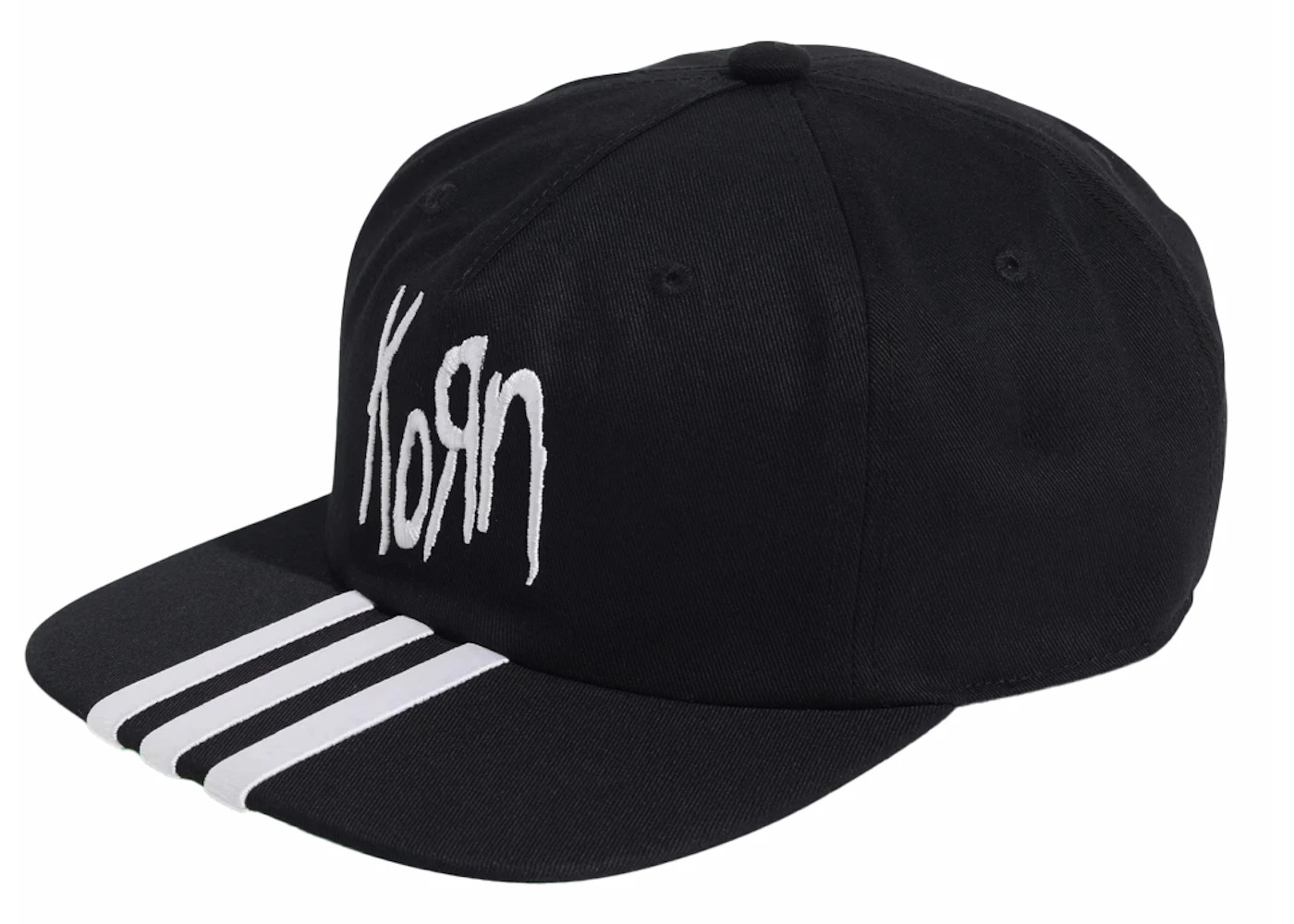 The adidas x KoRn Cap is a Black fabric billed baseball cap featuring the KoRn text logo with the signature reversed R embroidered on the front in white. The adidas signature 3-Stripes are embroidered on the bill in white, and the adidas trefoil logo is embroidered on the rear in white above the adjustable snapback. German brand adidas has been around for over a century, making their footwear and apparel design motifs truly iconic, attracting decades of admiration. KoRn is a nu metal band from Bakersfield, California, which developed an association with adidas during the 1990s by wearing adidas clothing from 1993 to 1997. Decades later, KoRn and adidas have partnered to create a few capsule clothing collections that express both entities‚Ao aesthetics. Our experts feel that the best feature of the adidas x KoRn Cap is its striped bill, which stands out from typical logo caps. The adidas x KoRn Cap Black released on May 15, 2024, and retailed at $40. - Season SS24 - Color Black - Release Date 2024-05-15 - Style JF3139 - Retail Price 40 - Featured false - Requester Kelsey K - Uploaded By LL