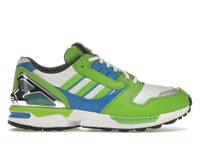 The adidas ZX 8000 Kawasaki Ninja is a shoe designed as part of a collaboration with the Japanese motorcycle brand Kawasaki. This iteration of the adidas ZX 8000 has a base made of white leather. It is decorated with perforations throughout, including on the toe box, heel collar, and lateral side. Semi-solar Green overlays round out the toe box, outline the eyestays, and provide support to the heel collar. The adidas three stripes also appear on the lateral side in Semi-solar Green, with small Bright Blue lines on the lower sides. Bright Blue also appears above the arches on each side and lines the bottom of the heel collar. Ninja branding is seen in black across the inner side of the shoe, and the heel is supported by a silver cage. The tongue features an adidas logo patch. A green and white midsole sits on top of a black outsole. What we like most about this shoe is the colorway, which is bright and bold. The adidas ZX 8000 Kawasaki Ninja was released on April 15, 2022, for $120. - Style GW3358 - Colorway Semi Solar Green/Semi Solar Green/Bright Blue - Retail Price 120 - Release Date 2022-04-15 - Featured false - Product Line adidas ZX