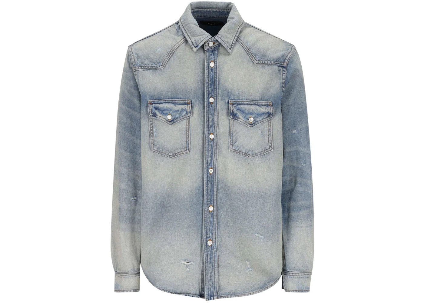 AMIRI Buttoned Distressed Denim Shirt Light Indigo