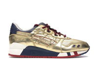 Part of the Kith Football Equipment campaign, the Ronnie Fieg x Asics Gel-Lyte III "USA" were made to stand out above other World Cup inspired sneaker projects. Release alongside an ASICS GT-II dubbed the "Brazil," the USA (or "Gold Medal") GL3 definitely did their intended purpose and stood out among contenders. One of the most unique aspects of the KFE release was Fieg's Kith pop-up shop in Sao Paulo that coincided with the World Cup. Kith also did a surprise online release of the USA GEL Lyte 3 that corresponded with the first goal that team USA scored during the World Cup. Interestingly enough, team USA scored historically early into their match and many people mistakenly believed that it coincided with the start of the game, rather than the opening goal. The USA Gel Lyte itself is a reflection of the year's worth of worth that RF and his team put into the KFE project. The Gold Medal dons red accents while the right shoe, navy, and although slightly different, the two work harmoniously together as a pair. From its pigskin leather sock liner to its nearly completely golden-leather upper, the Ronnie Fieg x Asics Gel-Lyte III "USA" screamed premium and quality at a $185 price-point. And although the secondary market doesn't reflect the work and thought that RF put into their release, the Gold Medal, KFE, GLIII was an extremely well-executed release. - Style H41JK-9494 - Colorway Gold/Gold - Retail Price 185 - Release Date 2014-06-28 - Featured false