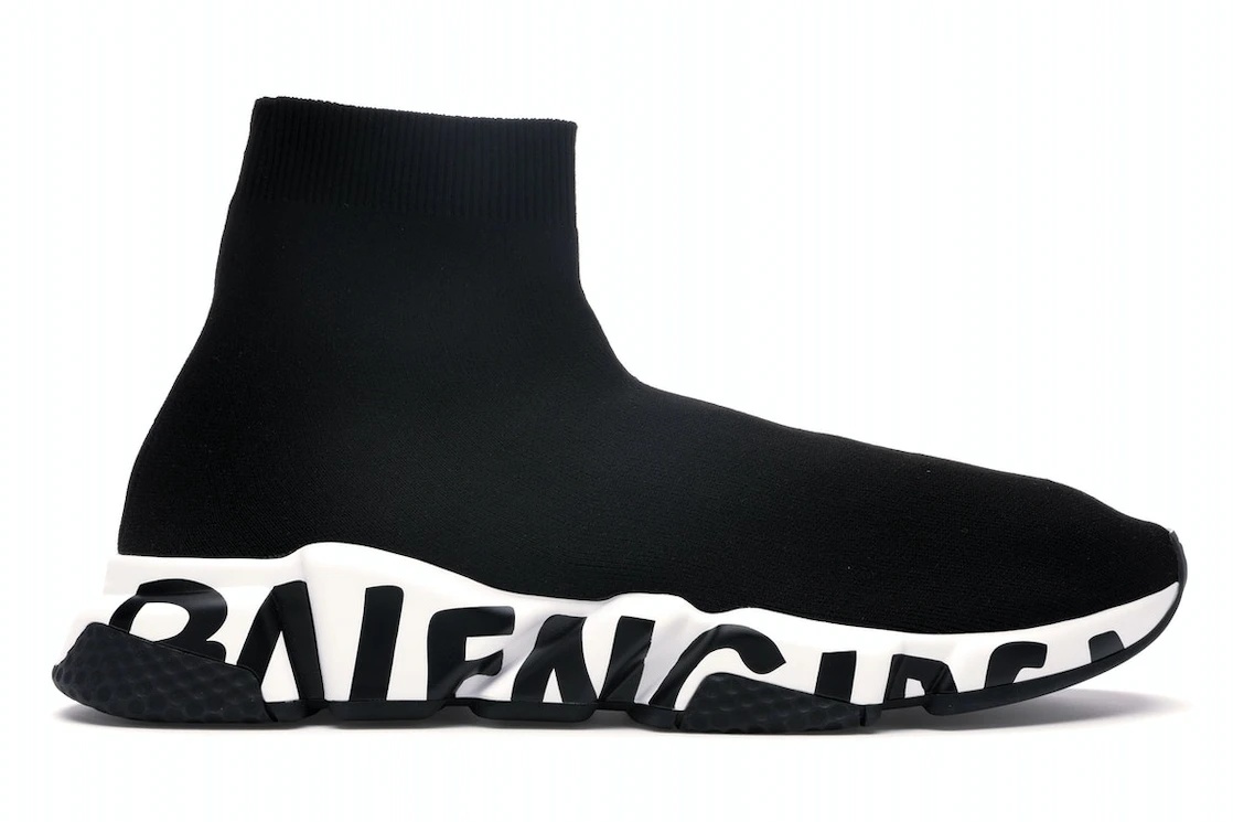 The Balenciaga Speed Graffiti Trainers Black White fuse athletic aesthetics with artistic flair, and in doing so, redefine the boundaries between fashion and contemporary art. These shoes are renowned for their sock-like construction, which is crafted from a breathable and flexible stretch-knit material. Their standout feature, however, is the graffiti-inspired artwork adorning the sides of the soles. The soles' white backgrounds allow the brand’s name to pop in black lettering that matches the solid colorway of the upper. A textured base to the rubber outsole provides reliable traction and durability for these shoes. What our experts love the most about the Balenciaga Speed Graffiti Trainers Black White, however, is the absence of laces and any other extraneous details that would compromise the intentionally minimalist nature of these shoes. They released for the very first time on November 1, 2019, with an original price tag of $795. - Style 605972W05GE1015 / 645334W2DB71015 - Colorway Black/White - Retail Price 795 - Release Date 2019-11-01 - Featured false