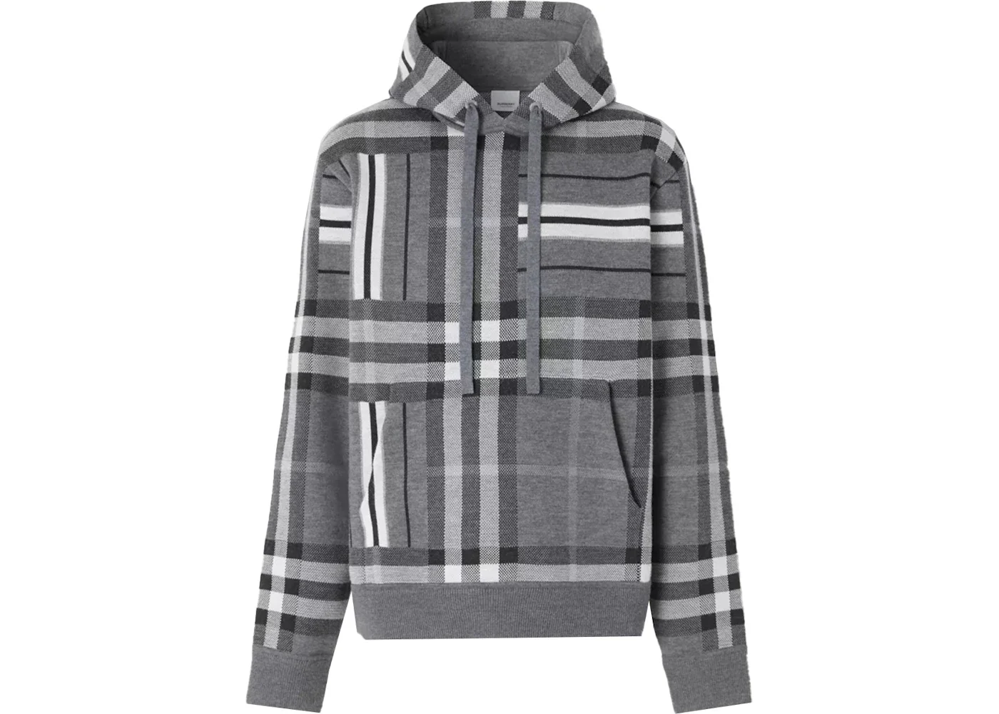 Burberry Check And Stripe Wool Blend Jacquard Hoodie Dark Grey Melange