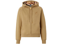 The Burberry Women’s Letter Graphic Cotton Blend Zip Hoodie Honey is a comfortable zip-up hoodie for women designed for extra warmth. This iteration of the Burberry Women’s Letter Graphic Cotton Blend Zip Hoodie comes in a dark yellow colorway reminiscent of the color of honey. This colorway dominates the entire sweatshirt, except for the inner lining, which can be seen in the hood. Burberry’s signature plaid red, brown, and cream stripes cross the honey lining. The Burberry "B" appears inside a small box stitched in gold on the upper right chest. The hoodie features two front pockets, a full zip closure, and drawstrings on the hood. Our favorite feature of this hoodie is the branding on the chest in gold stitching, which gives the otherwise simple hoodie a touch of elegance. The Burberry Women’s Letter Graphic Cotton Blend Zip Hoodie Honey was first released for the 2023 Spring/Summer season for a retail price of $920. - Season SS23 - Color Honey - Style 8061555 - Retail Price 920 - Featured false - Uploaded By NB