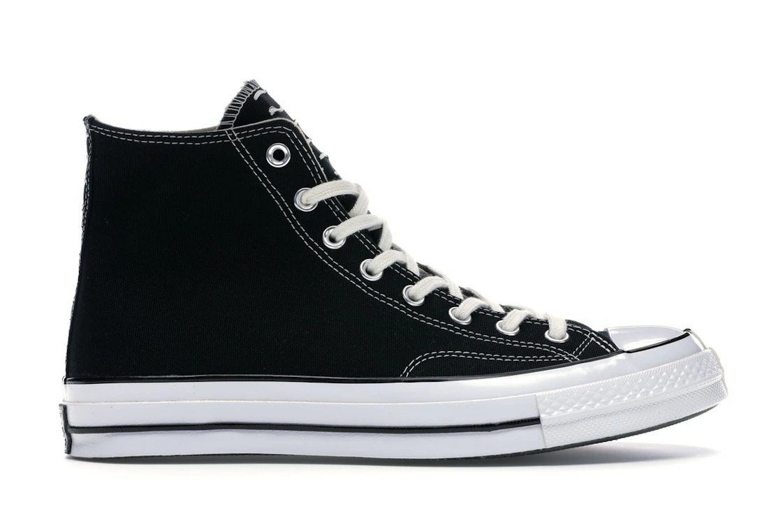 The Converse Chuck Taylor All-Star 70s Hi Reconstructed Slam Jam Black features a black "out of the box" shade on the side and was released as a part of the Slam Jam collection. The Slam Jam Chuck 70s Hi 'Reconstructed' features a mix of high-quality materials, combining canvas and rubber for the upper, providing durability and a classic look. The style boasts a unique design with a black "out of the box" shade on the side and a faded medial side, creating a striking contrast. The tongue connects the contrasting panels, enhancing the aesthetic appeal. With its midsole and rubber sole, this sneaker offers comfortable wear and compliments your overall look. Our team is particularly impressed with the shoe's thoughtfully crafted design featuring contrasting panels and a faded shade, creating an intriguing visual effect. This blending of materials showcases a seamless integration of canvas and rubber, contributing to the shoe's durability and distinct appearance. The Converse Chuck Taylor All-Star 70s Hi Reconstructed Slam Jam Black was released on the 15th of April 2019 and retailed at $90. - Style 164555C - Colorway Black/White-Egret - Retail Price 90 - Release Date 2019-04-15 - Featured false