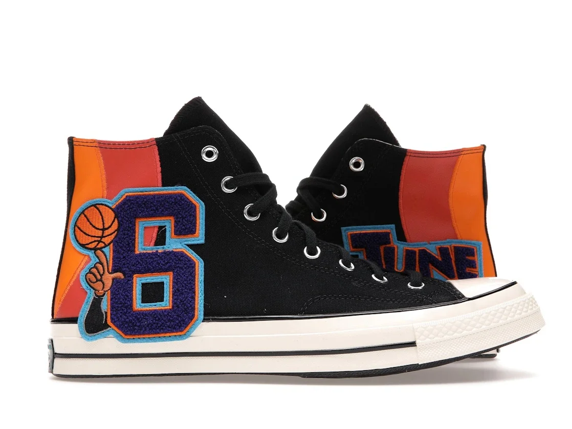The Converse Chuck Taylor All-Star 70 Hi Space Jam Tune Squad honors the newest Tune Squad member, LeBron James with his "6" number and "Tune Squad" chenille patches stitched on either side of the heel. A classic white and black sole with a matching toe cap adds the finishing touch. The Converse Chuck Taylor All-Star 70 Hi Space Jam Tune Squad released in July of 2021 and retailed for $120. - Style 172482C - Colorway Black/Mantra Orange/Multi - Retail Price 120 - Release Date 2021-07-16 - Featured false