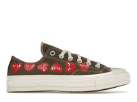 The Converse Chuck Taylor All-Star 70s Ox Comme des Garcons Multi Heart Green was released in part of a collaborative effort between sneaker brand Converse and and the Japanese fashion label Comme des Garcons. The shoe features a canvas upper covered in Vibrant Green with a white chunky rubber outsole. It has the Comme des Garcons heart logo featured multiple times throughout the shoe with the heart graphics placed in a scattered and overlapping manner, creating a playful and unique aesthetic. The shoe maintains the classic Chuck Taylor details, such as the rubber toe cap, white laces, and the Converse All-Star logo patch on the heel. A stand-out feature of the Converse Chuck Taylor All-Star 70s Ox Comme des Garcons Multi Heart Green has to be the heart graphics, which instantly add a touch of color and a bit of character to the shoe - making it a stand-out piece in any closet. The shoe was released for retail on March 16, 2019 priced at $130. - Style 162976C - Colorway Green - Retail Price 130 - Release Date 2019-03-16 - Featured false
