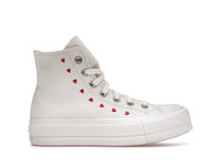 The women's Converse Chuck Taylor All-Star Lift Hi White Red (W) features a cream canvas upper with red embroidered heart detailing adjacent to the eyestay. From there, a signature rubber toe cap and matching sole complete the design. The women's Converse Chuck Taylor All-Star Lift Hi White Red (W) released in February of 2022 and retailed for $100. - Style A01599C - Colorway White/Red/Egret - Retail Price 100 - Release Date 2022-02-21 - Featured false