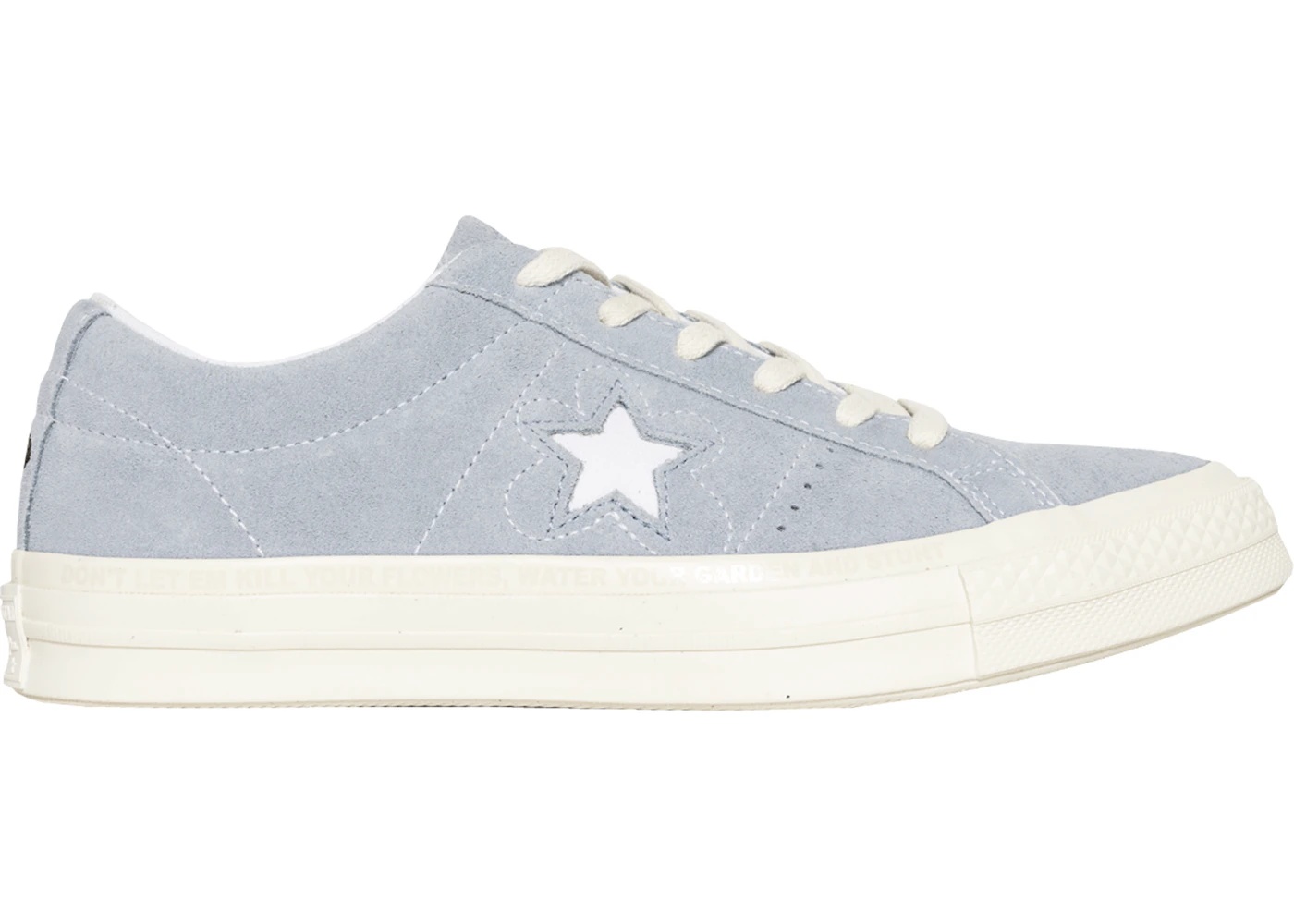 This Converse One Star Ox is known as the "Airway Blue" edition. A part of the "Golf le Fleur" Collection, they were made in collaboration with Tyler The Creator. This pair comes in blue and white. Sporting a full suede upper with flower stitching around the star logo on the sides, a debossed "Golf le Fleur" logo on the tongue, an embroidered bee logo on the back heels and custom graphics on the insoles and botom of the outsole. You can also find the phrase, "don’t let ‘em kill your flowers, water your garden and stunt" on the sockliner as well as the outsole. Their release date was August 3rd, 2017 where they retailed for $100 in men's sizes only. If you're a fan of Tyler The Creator or the Converse One Star, make sure you have a pair of these in your collection. If you're looking to buy, hit up the marketplace. Those that want to sell can do so online today. - Style 159432C - Colorway Blue/White - Retail Price 100 - Release Date 2017-08-03 - Featured false