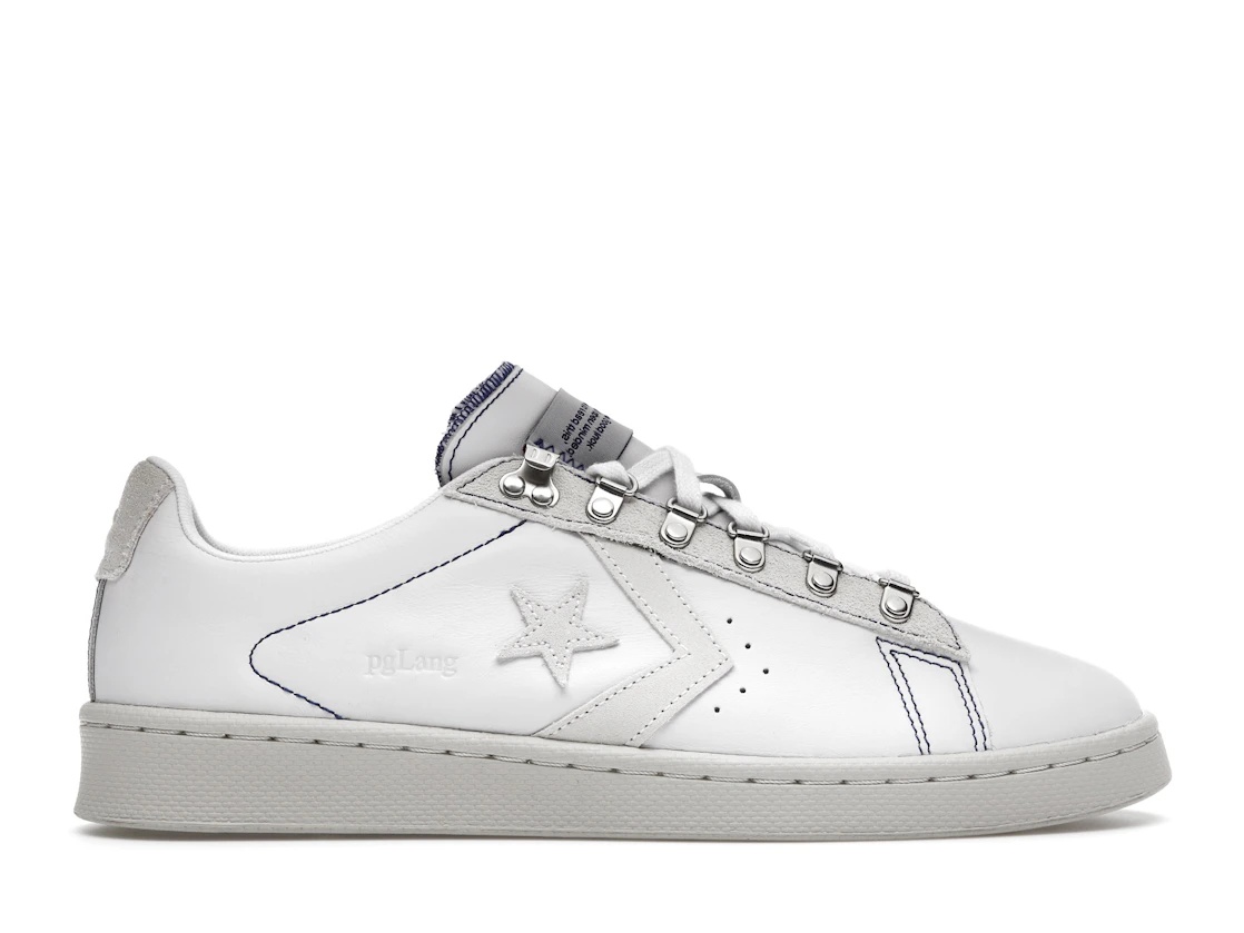 The Converse Pro Leather Kendrick Lamar pgLang White arrives in a smooth white leather construction with light grey Nubuck overlays, blue contrast stitching, and metal lace clasps. At the base, a cream sole adds the finishing touch. The Converse Pro Leather Kendrick Lamar pgLang White released in May of 2022 and retailed for $90. - Style A00692C - Colorway White/Vaporous Grey - Retail Price 90 - Release Date 2022-05-02 - Featured false