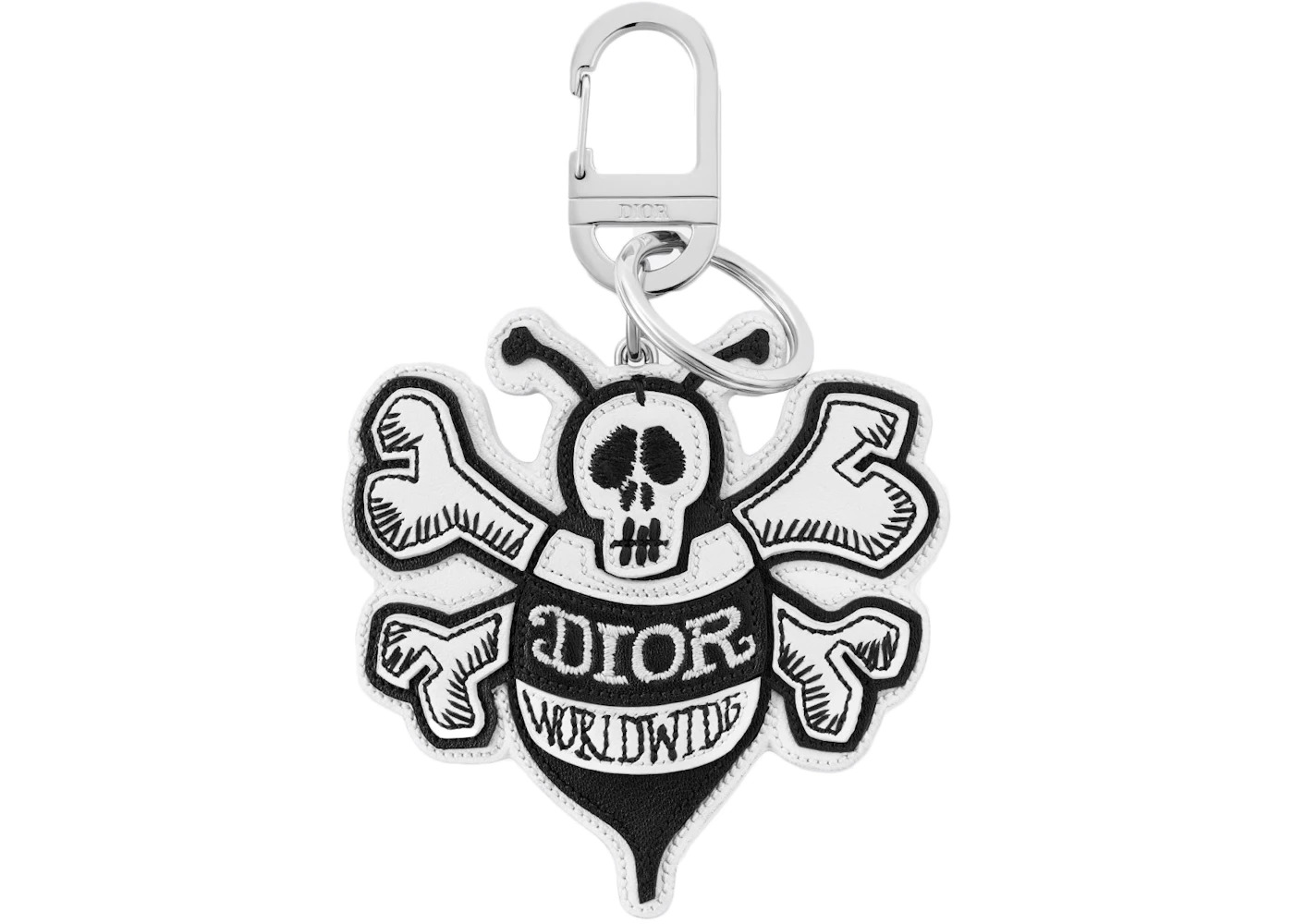The highly anticipated Dior Stussy Fall 2020 collaboration was released in June 2020. Kim Jones brought streetwear industry veteran Shawn Stussy out of retirement to bring his distinctive penmanship and surfer vibe to the House of Christian Dior. The DIOR AND SHAWN Bee Key Ring, Black/White, reimagines the House's iconic bee emblem in smooth and grained calfskin. This Dior keyring features a palladium-finish split ring and carabiner clip. This whimsical charm can be attached to keys, a bag, or a belt loop. The DIOR AND SHAWN Bee Key Ring, Black/White, is Made in Italy, and measure 9 cm x 9.2 cm x 0.5 cm. The Dior Reference Number is 2CHKH253ZAP_H42E.Please Note: Dust bag and box are not required for this accessory. - Dimensions 3.6H 3.5W 0.1D - Material Calfskin - Retail Price 430 - Color Black/White - Hardware Palladium-finish - Style 2CHKH253ZAP_H42E - Season FW20 - Base Model Bee Key Ring - Base Model Variety And Shawn - Color Generic Black - Depth 0.1 - Featured false - Height 3.6 - Styles Keychain - Width 3.5