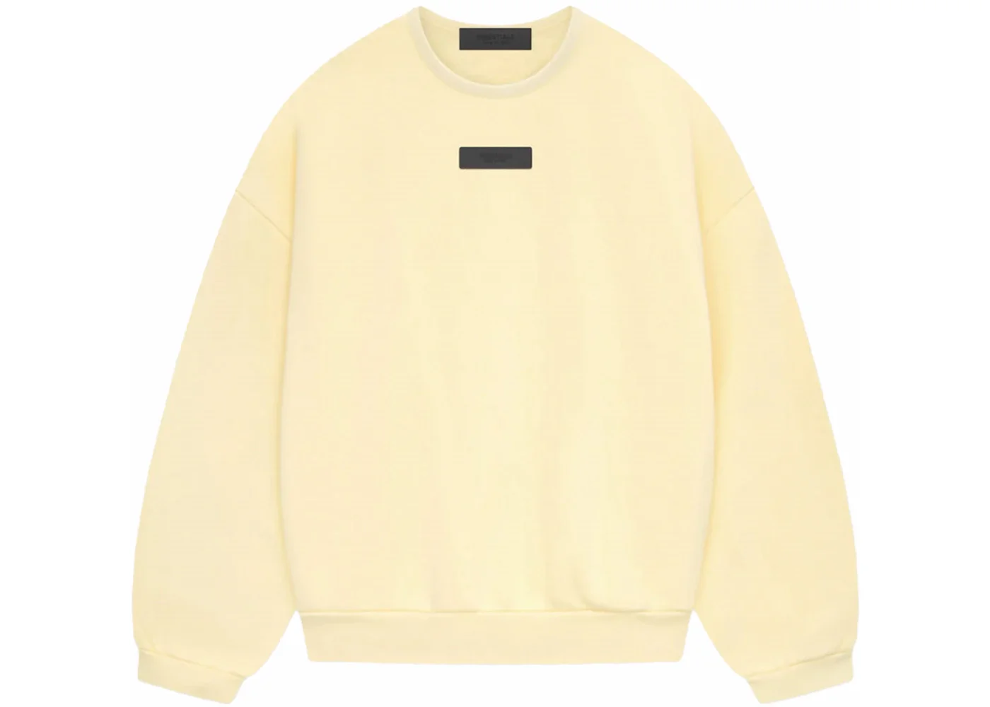 The Essentials crewneck is made in core fleece and designed with volume to create a round, cropped silhouette. New minimalist branding is seen in the rubberized Essentials Fear of God black bar on the center front. Details include side seam pockets, a new crew neckline with stretch binding at the collar, rib-knit cuffs, and a waist hem. A Fear of God rubberized label is at the back collar. - Season FW23 - Color Garden Yellow - Release Date 2023-12-14 - Retail Price 90 - Featured false - Requester Kelsey K - Uploaded By LL