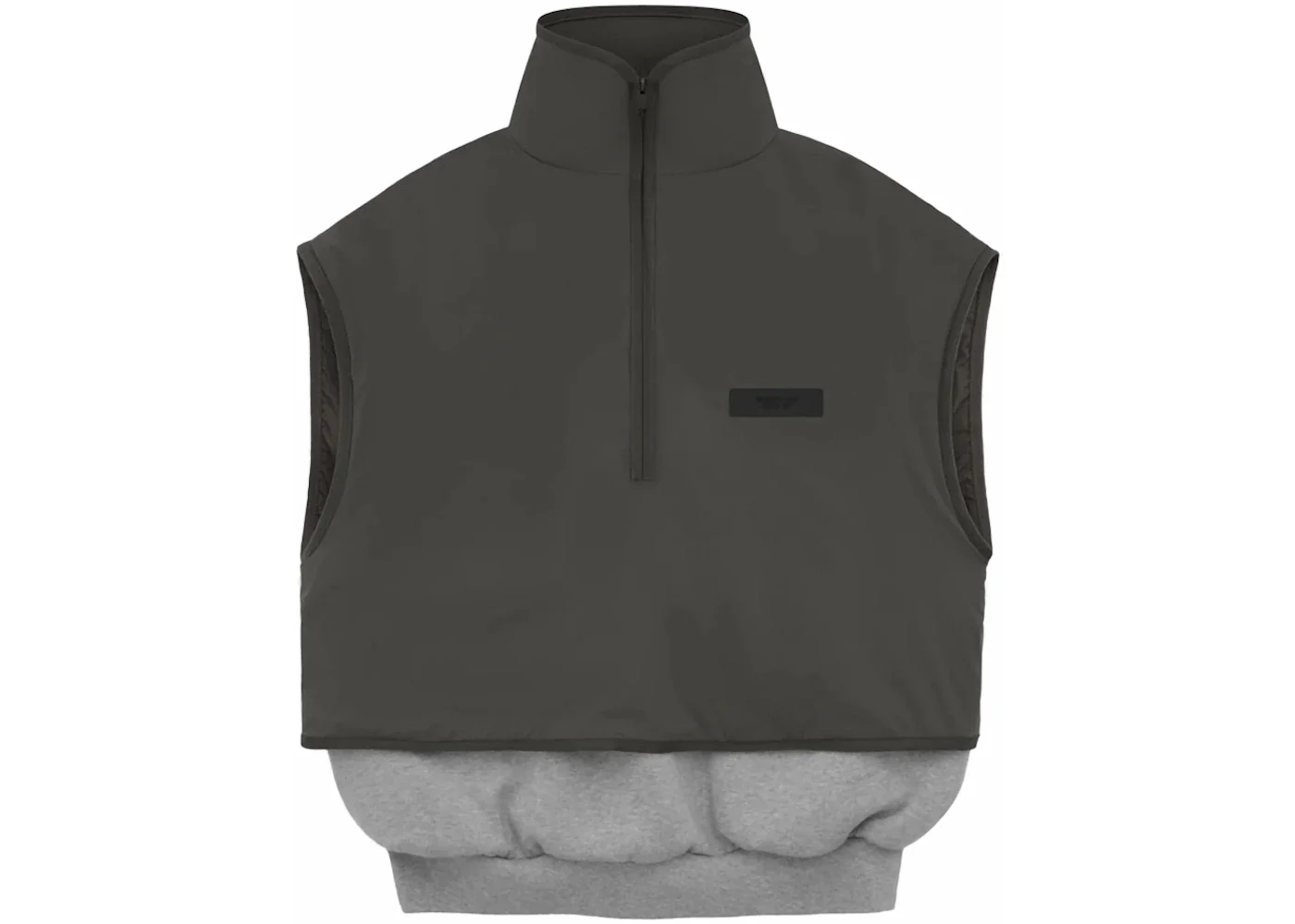 A new style inspired by the layered looks of the 90s, the Essentials mock neck vest is made in core fleece and covered by a stretch nylon shell. The piece is designed with volume to create a round, cropped silhouette. Details include a mock neckline, side seam pockets, and rib-knit waist hem. New minimalist branding is seen in the rubberized Essentials Fear of God black bar on the front. A Fear of God rubberized label is at the back collar. - Season FW23 - Color Dark Heather Oatmeal/Ink - Release Date 2023-12-14 - Retail Price 190 - Featured false - Requester Kelsey K - Uploaded By LL