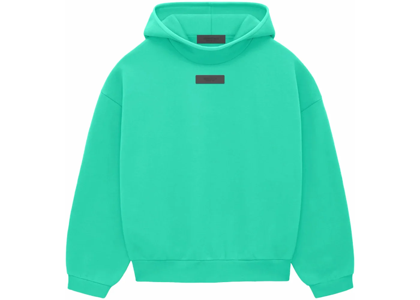 The Essentials hoodie is made in core fleece and designed with volume to create a round, cropped silhouette. Details include a mock neckline, side seam pockets, rib-knit cuffs, and waist hem. New minimalist branding is seen in the rubberized Essentials Fear of God black bar on the center front. A Fear of God rubberized label is on the hood. - Season FW23 - Color Mint Leaf - Release Date 2023-12-14 - Retail Price 100 - Featured false - Requester Kelsey K - Uploaded By LL