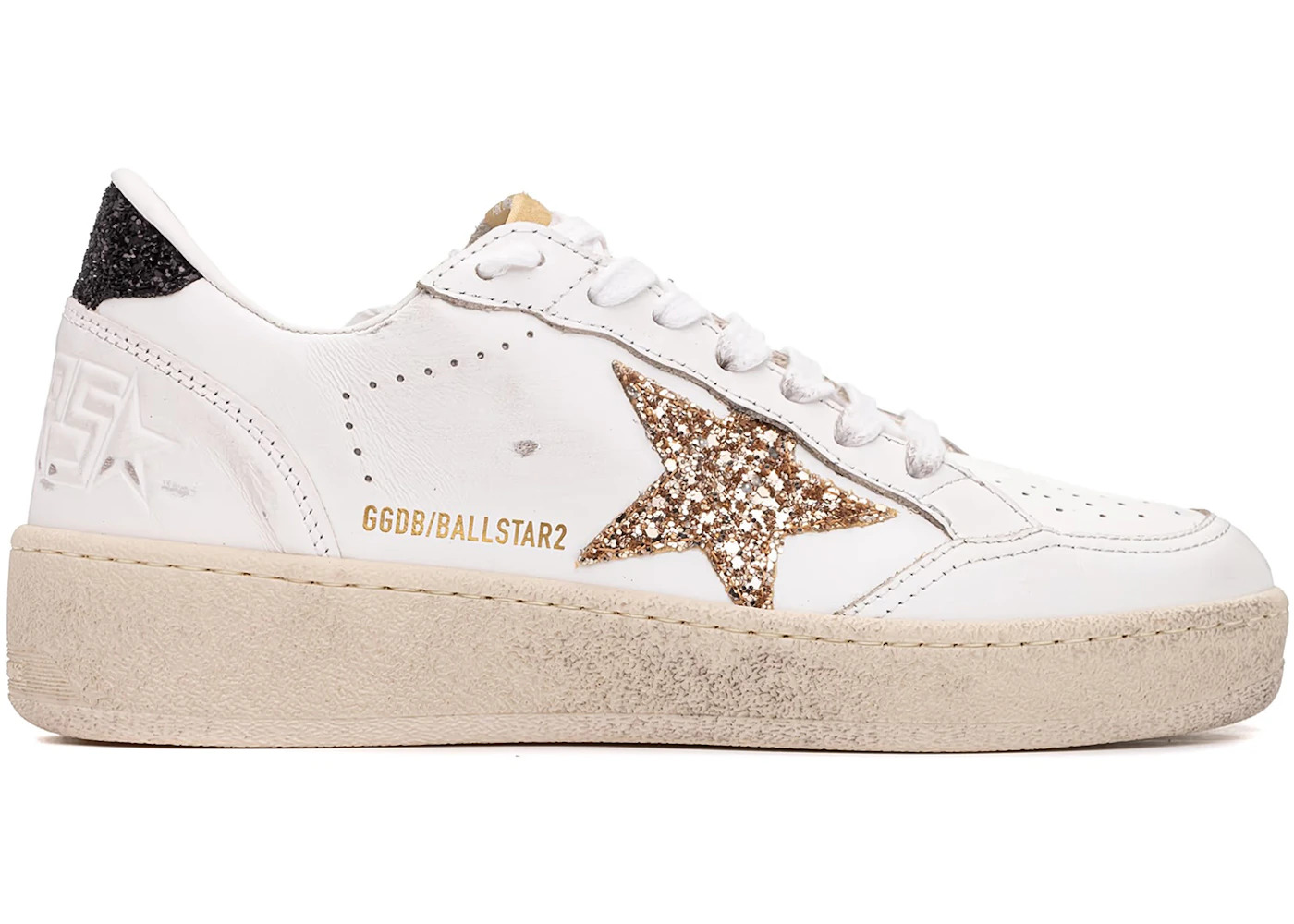 Women’s Ball Star in white leather with gold glitter star and black glitter heel tab