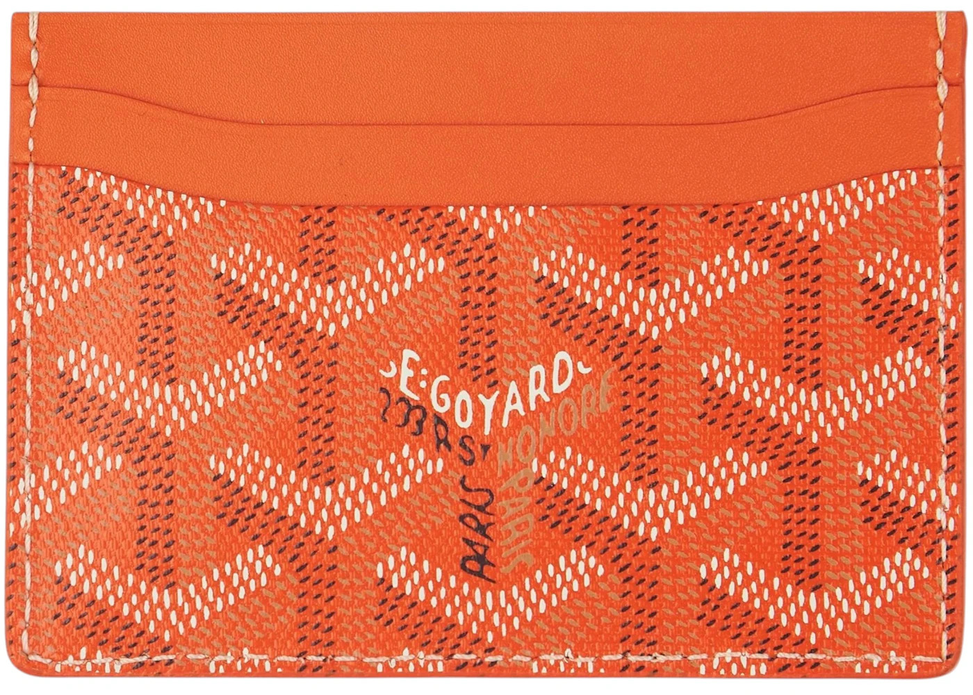 The Goyard Saint-Sulpice Card Wallet measures 4.1 inches across and 2.8 inches high. The Goyard card case features four card pockets, and one central pocket. Goyard Style Number STSULPPMLTY07CL07X is Made in France. Please Note: Dust bag and box are not required for this accessory. - Dimensions 2.7H 4.1W 0.07D - Material Canvas/Calfskin - Retail Price 480 - Color Orange - Style STSULPPMLTY07CL07X - Base Model Saint Sulpice - Color Generic Orange - Depth 0.07 - Featured false - Height 2.7 - Interior Color Yellow Calfskin Interior Lining - Requester Rachel M - Styles Card Case - Uploaded By ML - Width 4.1