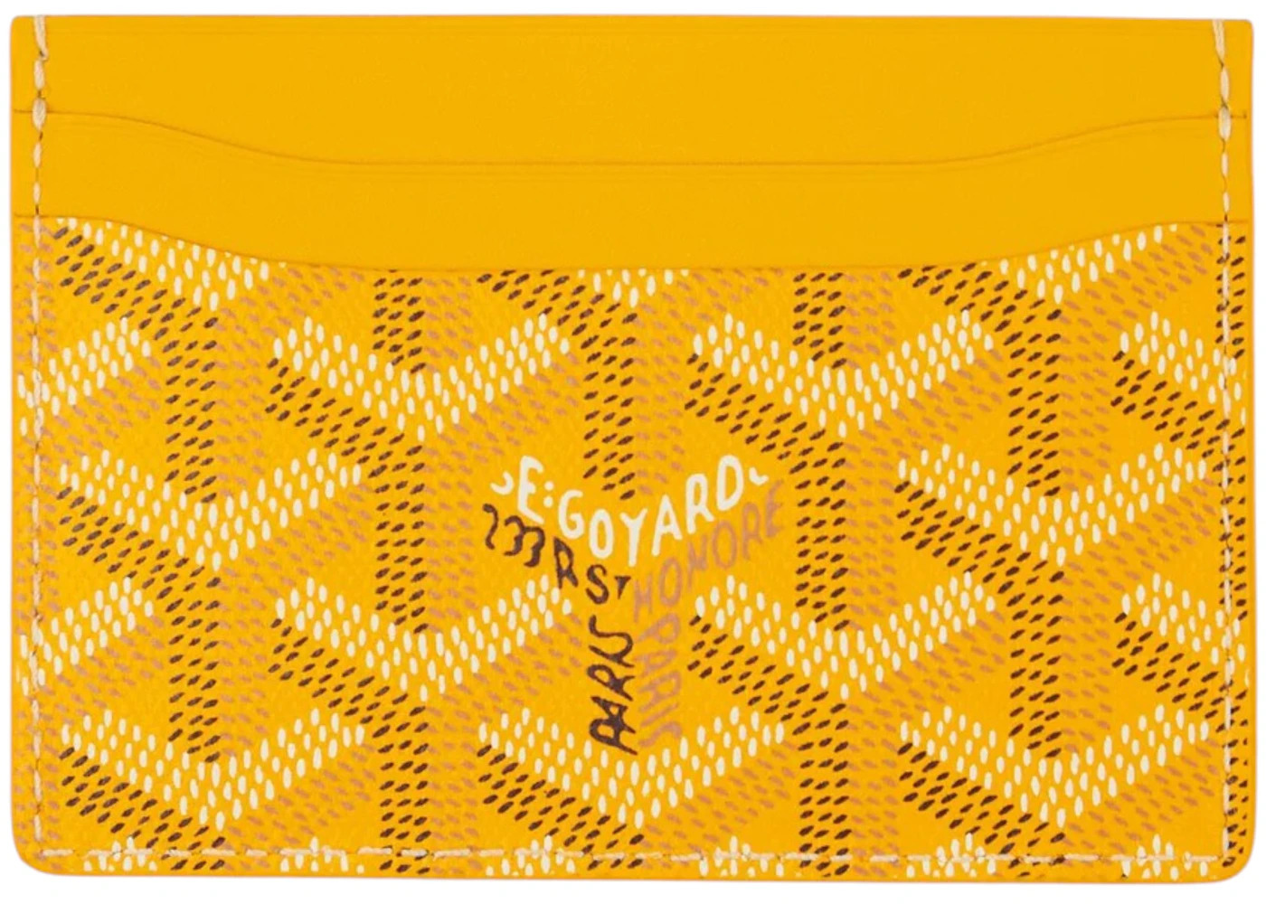 The Goyard Saint Sulpice Card Holder Chevron Yellow is a recent addition to the brand's growing accessories collection. It comes in a yellow pattern and is embroidered on both sides. The card holder utilizes a combination of canvas and calfskin in its design. The canvas covers the entire outer part of the product, with a chevron pattern throughout in contrasting hues. The inside of this case has numerous card slots on each side. The front upper part displays the E. Goyard and Paris labels. The Goyard Saint Sulpice Card Holder Chevron Yellow debuted on May 6th, 2019. It retailed at $590.Please Note: Dust bag and box are not required for this accessory. - Dimensions 2.7H 4.1W 0.07D - Material Canvas/Calfskin - Retail Price 590 - Color Yellow - Style STSULPPMLTY08CL08X - Base Model Saint Sulpice - Color Generic Yellow - Depth 0.07 - Featured false - Height 2.7 - Interior Color Yellow Calfskin Interior Lining - Requester Rachel M - Styles Card Case - Uploaded By ML - Width 4.1