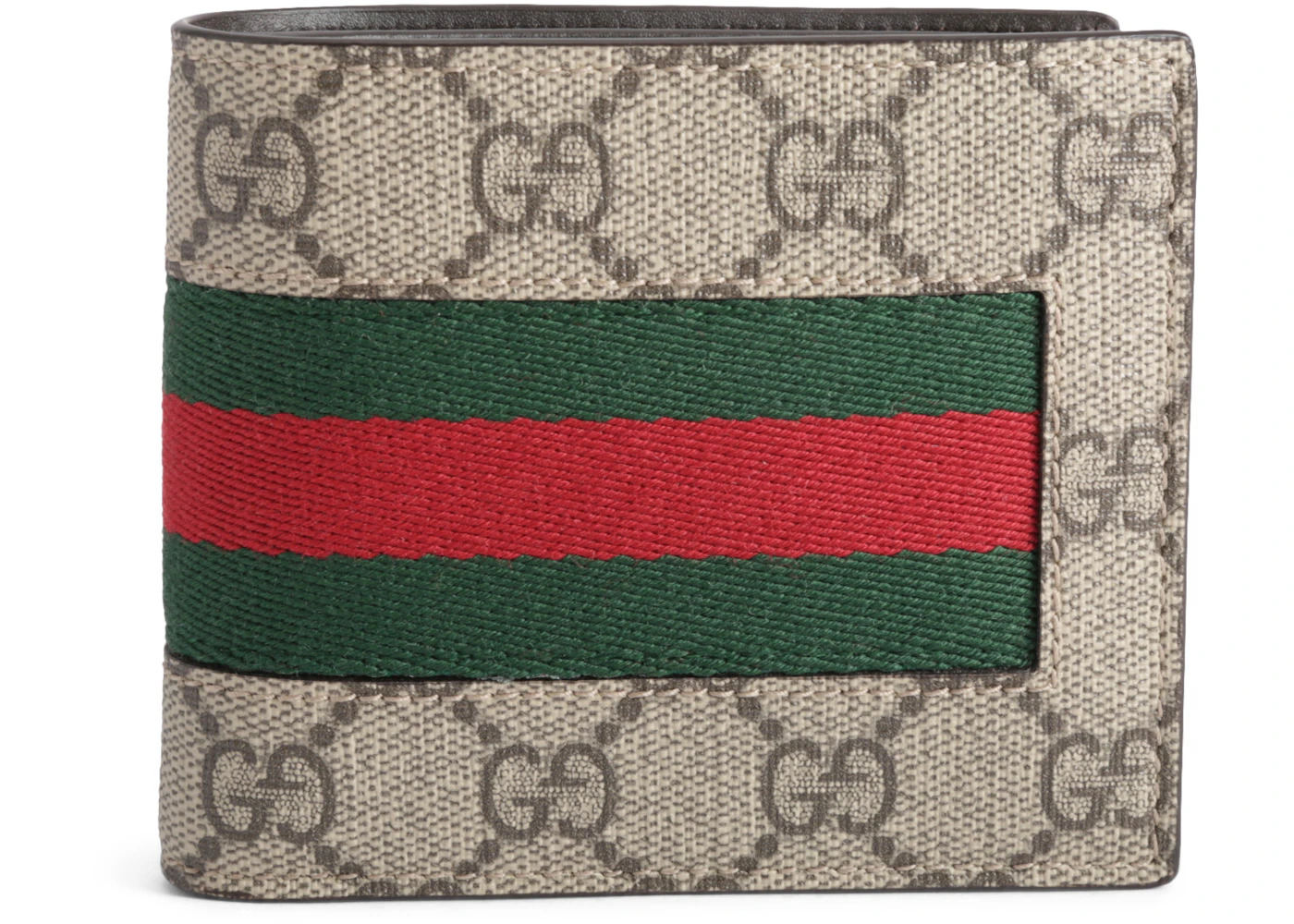 This Gucci bifold wallet features GG supreme print against a brown coated canvas and a red and green web stripe that wraps around it. The wallet opens to an interior of brown leather and features eight card slots and a bill pocket.Please Note: Dust bag and box are not required for this accessory. - Dimensions 3.5H 4.5W - Material Coated Canvas - Retail Price 380 - Color Brown - Base Model Wallet - Base Model Variety Bifold - Color Generic Brown - Exterior Variant Web - Featured false - Height 3.5 - Interior Color Brown - Pattern Monogram - Pattern Variant GG Supreme - Styles Wallet - Width 4.5