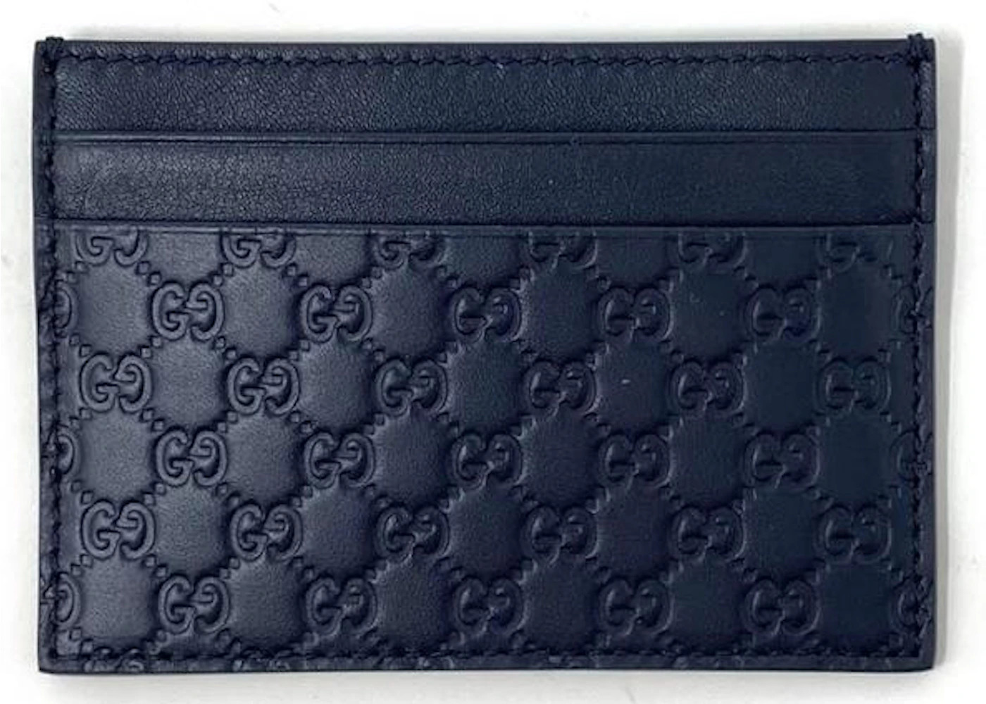 Made in Italy, the Gucci Card Case Microguccissima (5 Card Slot) is a small-sized card holder constructed purely from Navy Blue leather. Small enough to fit a bag and even a pocket, this card case has a height of 3 inches, a width of 4 inches, and a depth of 2.75 inches. It features five sizeable slots, four side slots, and one central multipurpose slot which provide carrying space for business cards, personal cards, as well as folded notes. It also features printed Gucci logos on its leather exterior. The Gucci Card Case Microguccissima (5 Card Slot) was released in July 2017 at a retail price of $200.Please Note: Dust bag and box are not required for this accessory. - Dimensions 3H 4W 2.75D - Material Calfskin Leather - Color Navy Blue - Base Model Card Case - Color Generic Blue - Depth 2.75 - Featured false - Height 3 - Pattern Microguccissima (3 Card Slot) - Styles Card Case - Width 4