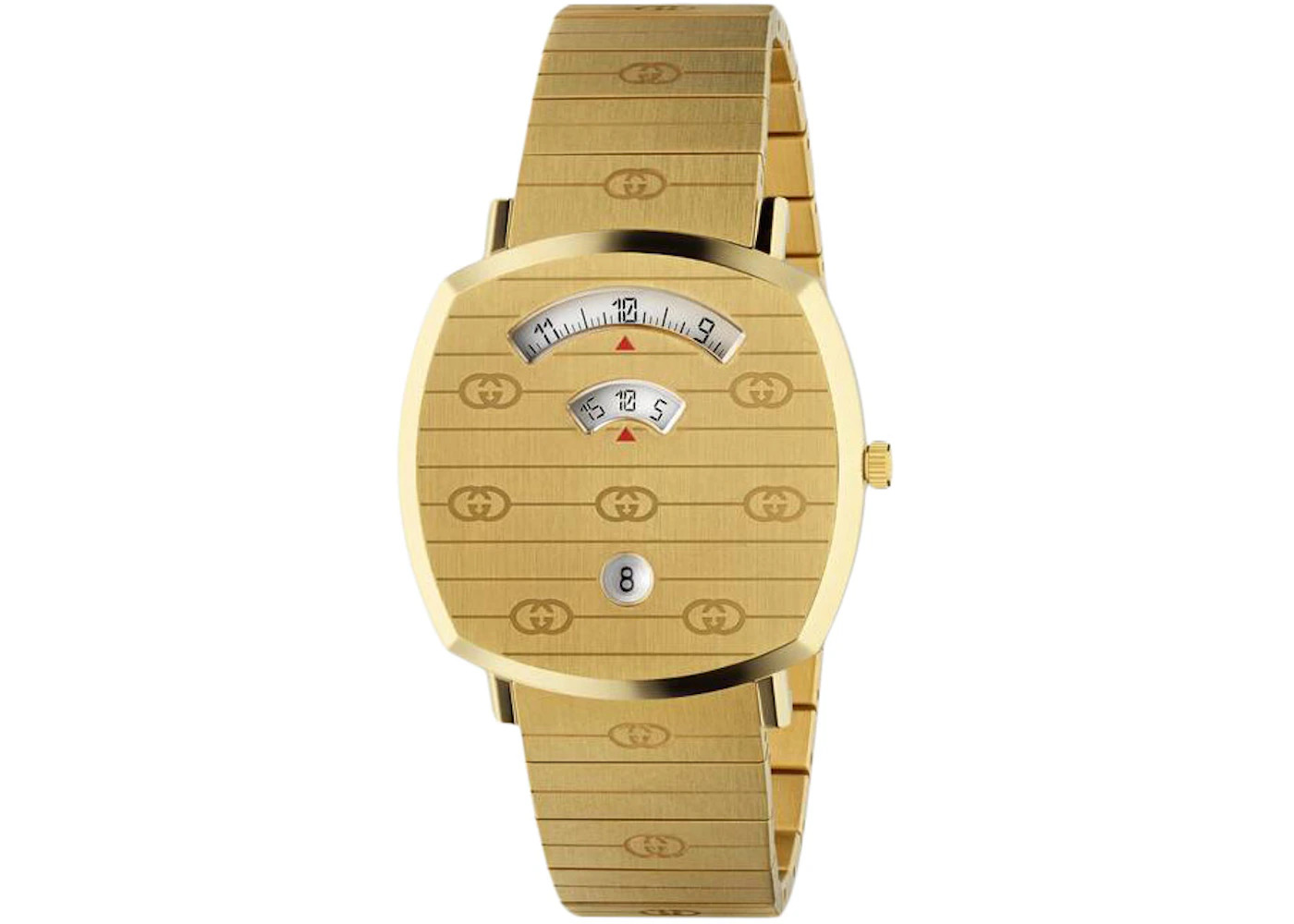 The Gucci Grip 596509 I8600 8740 is a statement watch from the Italian luxury brand, Gucci. The Grip 596509 I8600 8740 timepiece has Swiss-made quartz movement technology—an accurate and reliable way to keep time. It also features a brushed stainless steel case, a gold dial with the Gucci logo, and three sub-dials, which provide information on the hour, minutes, seconds, and date. The sub-dials are operated by the buttons located on the side of the case. The stainless-steel case measures 35mm in diameter, making it ideal for both men and women. The watch face is protected by a sapphire crystal that has an anti-reflective coating to ensure it remains scratch-resistant. We especially love the Gucci Grip 596509 I8600 8740 for its curved rectangular shape, which sits snugly and comfortably on the wrist like a "grip." The timepiece was released on September 21st, 2019 at a retail price of $1,900. - Reference Number 596509 I8600 8740 / YA157409 - Case Size 38mm - Case Material Yellow Gold - Band Yellow Gold - Movement Quartz - Dial Gold - Retail Price 1900 - Base Model Grip - Featured false - Styles Dress