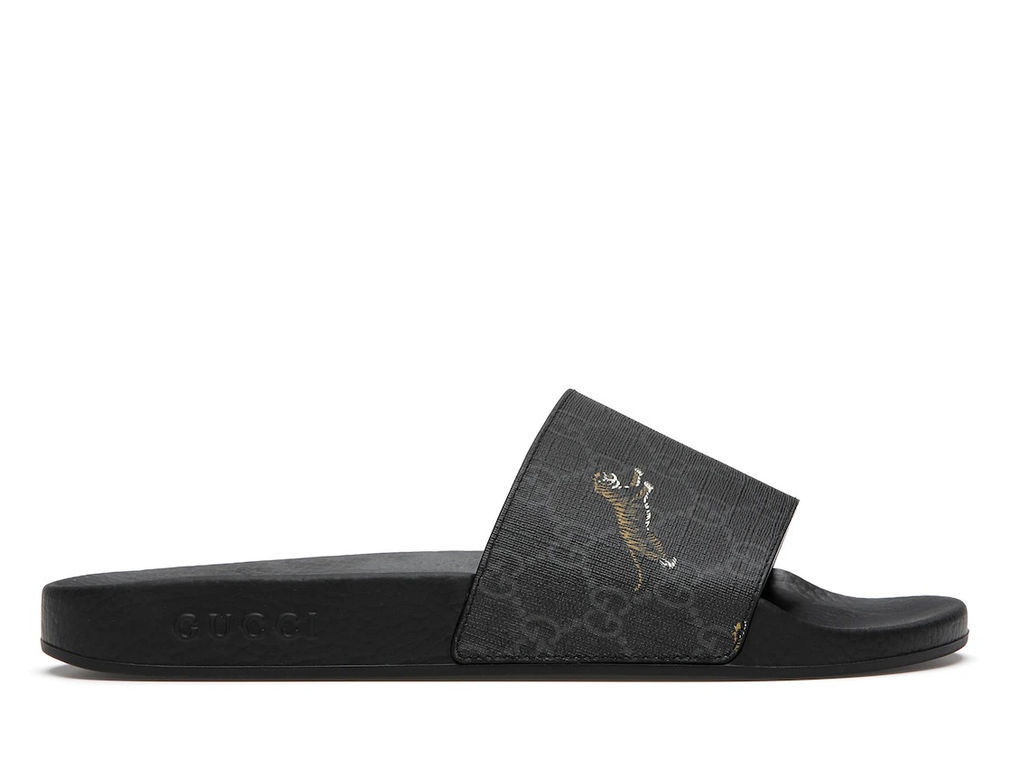 The Gucci Slide GG Supreme Tigers is a flat slip-on sandal from Gucci, the Italian luxury fashion brand. Starting with the black outsole of this Gucci Slide, you’ll notice GUCCI branding on the back lateral heel base. The outsole is thick and elevates the heel slightly. The wide upper strap leaves the toes open and is adorned with subtle GG Supreme logos. These iconic symbols pay homage to the brand’s founder, Guccio Gucci. This flat silhouette goes on to feature two tigers on the upper strap, giving it a dynamic element. These slides are great for casual outings, lounging by the pool, running quick errands, and keeping your feet cool and comfortable. Our experts feel the standout feature in this shoe is its over aesthetic that is synonymous with the Gucci brand, sleek and never out of style. The Gucci Slide GG Supreme Tigers was released on June 1, 2019, and retailed for $320. - Style 407345 G0K00 1084 - Colorway Black - Retail Price 320 - Release Date 2019-06-01 - Featured false